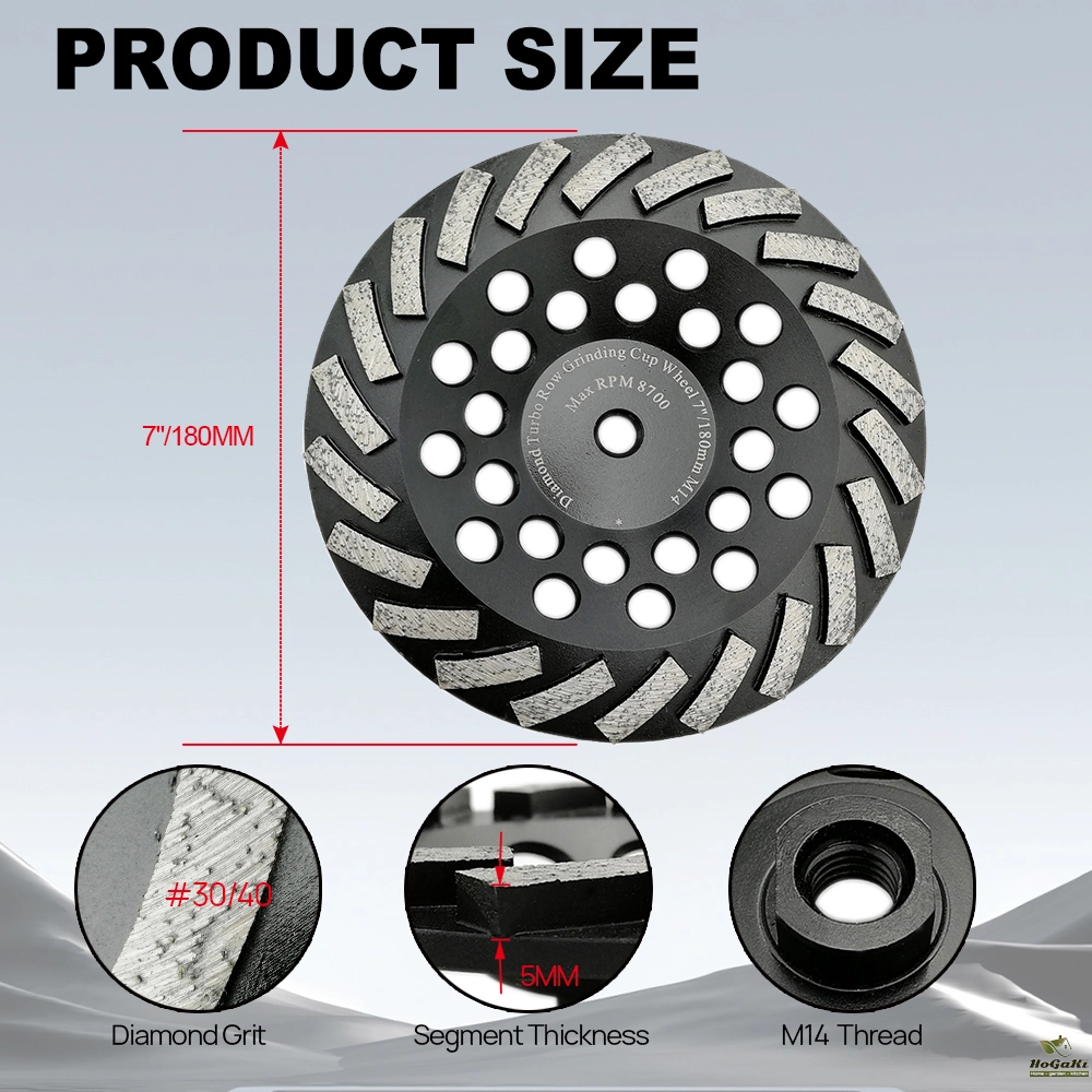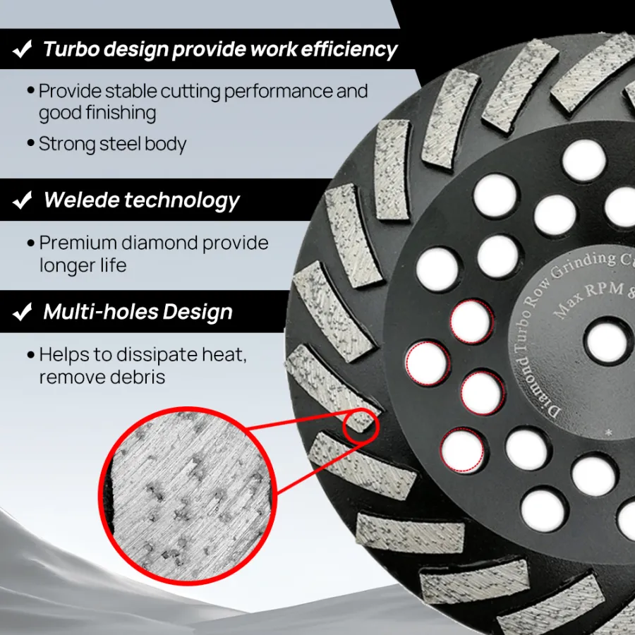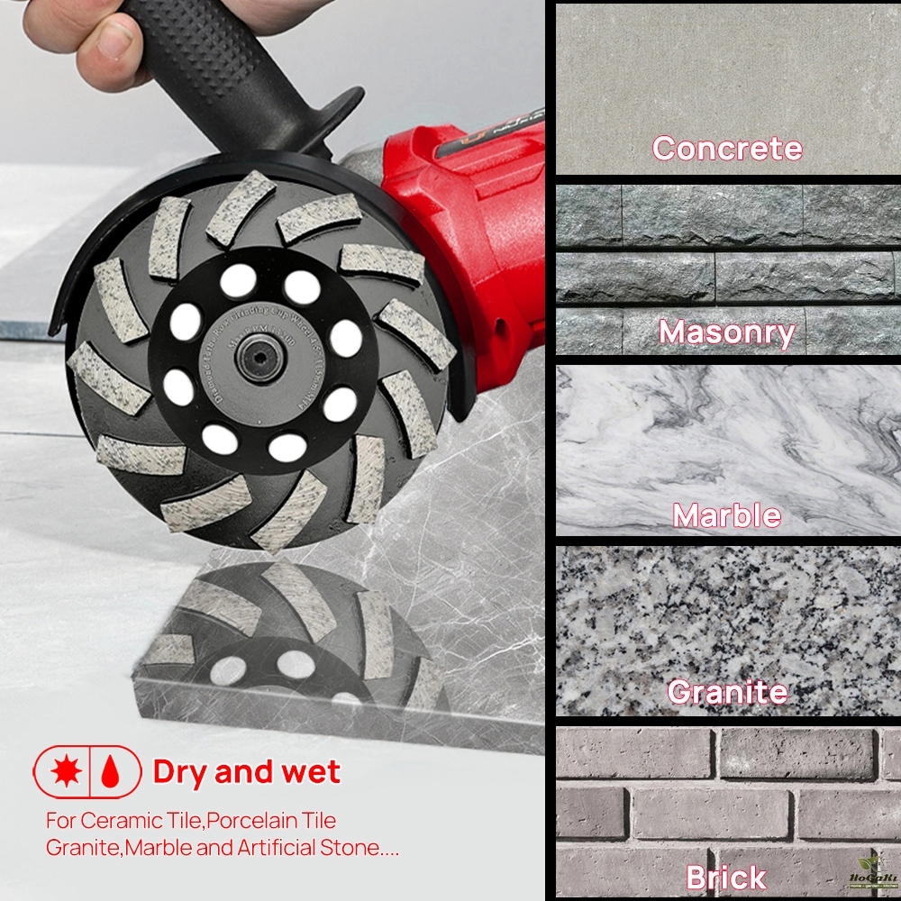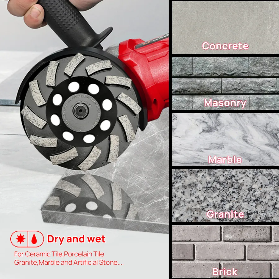 2, The spiral turbine design with segments and very coarse diamond particles provides very high efficiency and very fast grinding speed. If you need better polishing, please choose the cup grinding wheel with finer diamond particles;