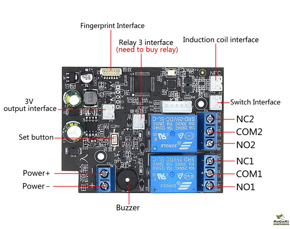 2) Jika sidik jari atau kartu berhasil dibuka kembali, relai 2 juga akan terhubung. Setelah melepaskan jari atau melepas kartu, relai 2 akan segera mati.