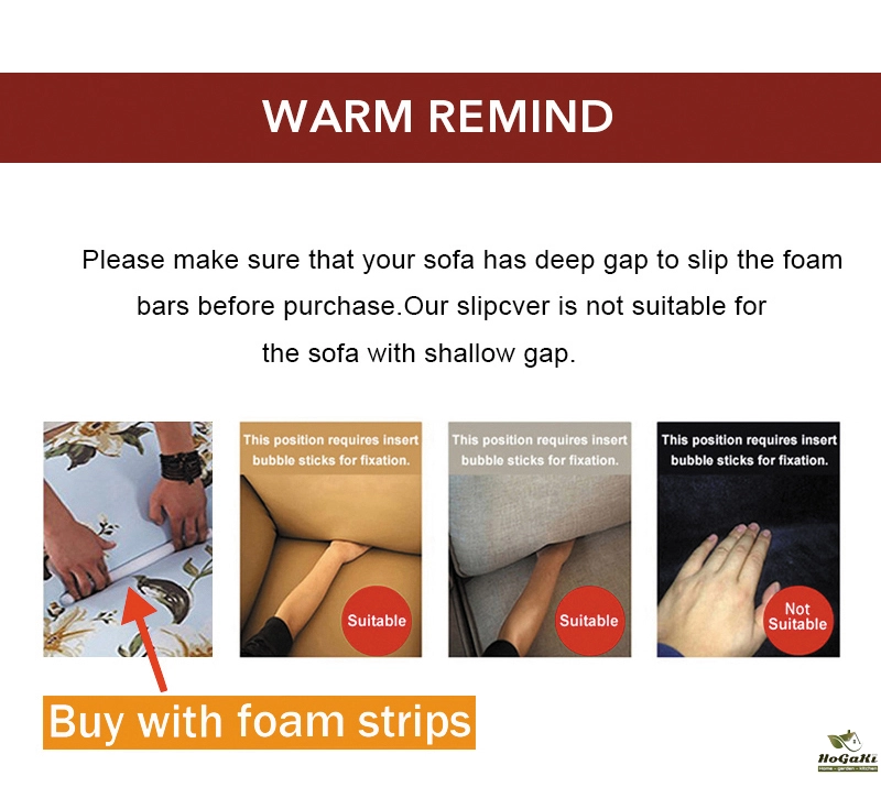 1. This sofa cover applicable to sofa which there is a gap,between seat with backrest and armrest.(Please make sure that your sofa has deep gap to slip the foam bars before purchase.Our sofa cover is not suitable for the sofa with shallow gap.)