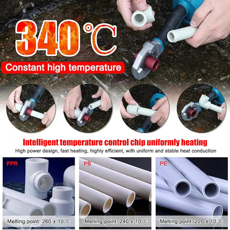 1. The water pipe welding device adopts high-power design, fast heating speed, high efficiency, uniform and stable heat conduction. Intelligent temperature control chip, 340℃ constant temperature and high temperature, uniform heating. Equipped with 20mm, 25mm, 32mm three different specifications of hot hair, can be easily replaced according to different uses.