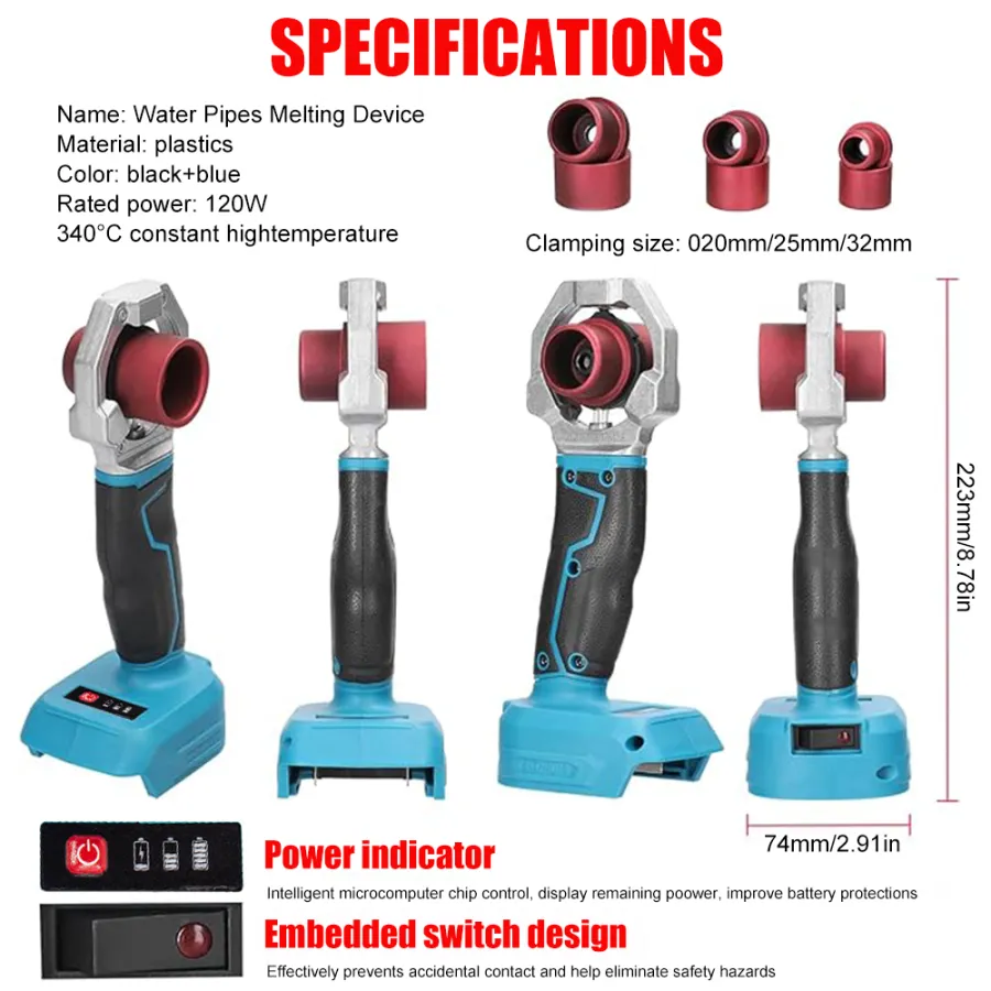 2. Lithium battery power supply (not included), wireless and convenient, not limited by power supply, convenient for hot melt water pipe when there is no power supply. Equipped with power indicator, intelligent microcomputer chip control, display remaining power, improve battery protection.