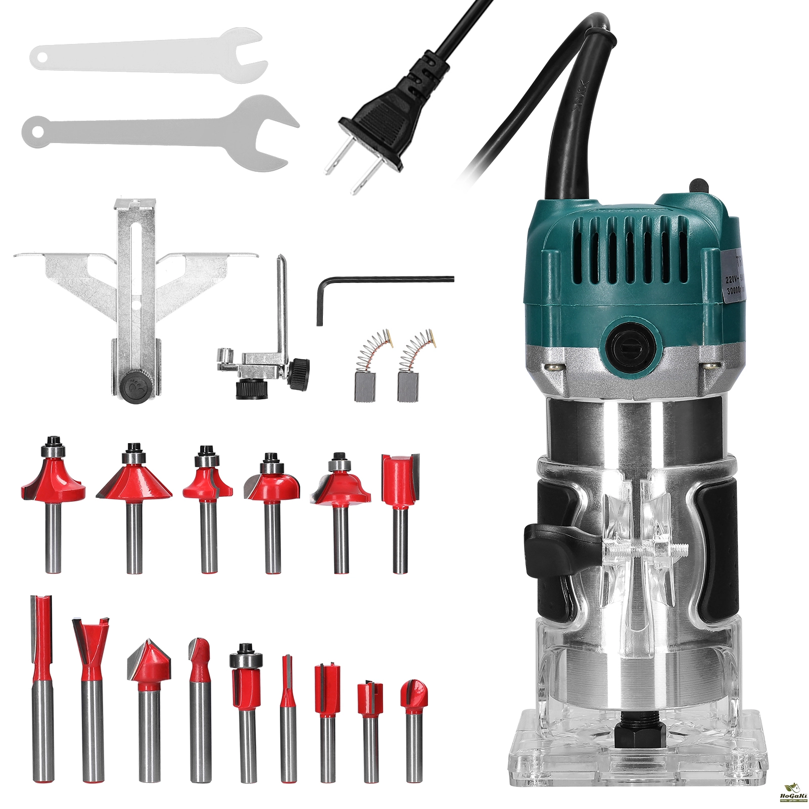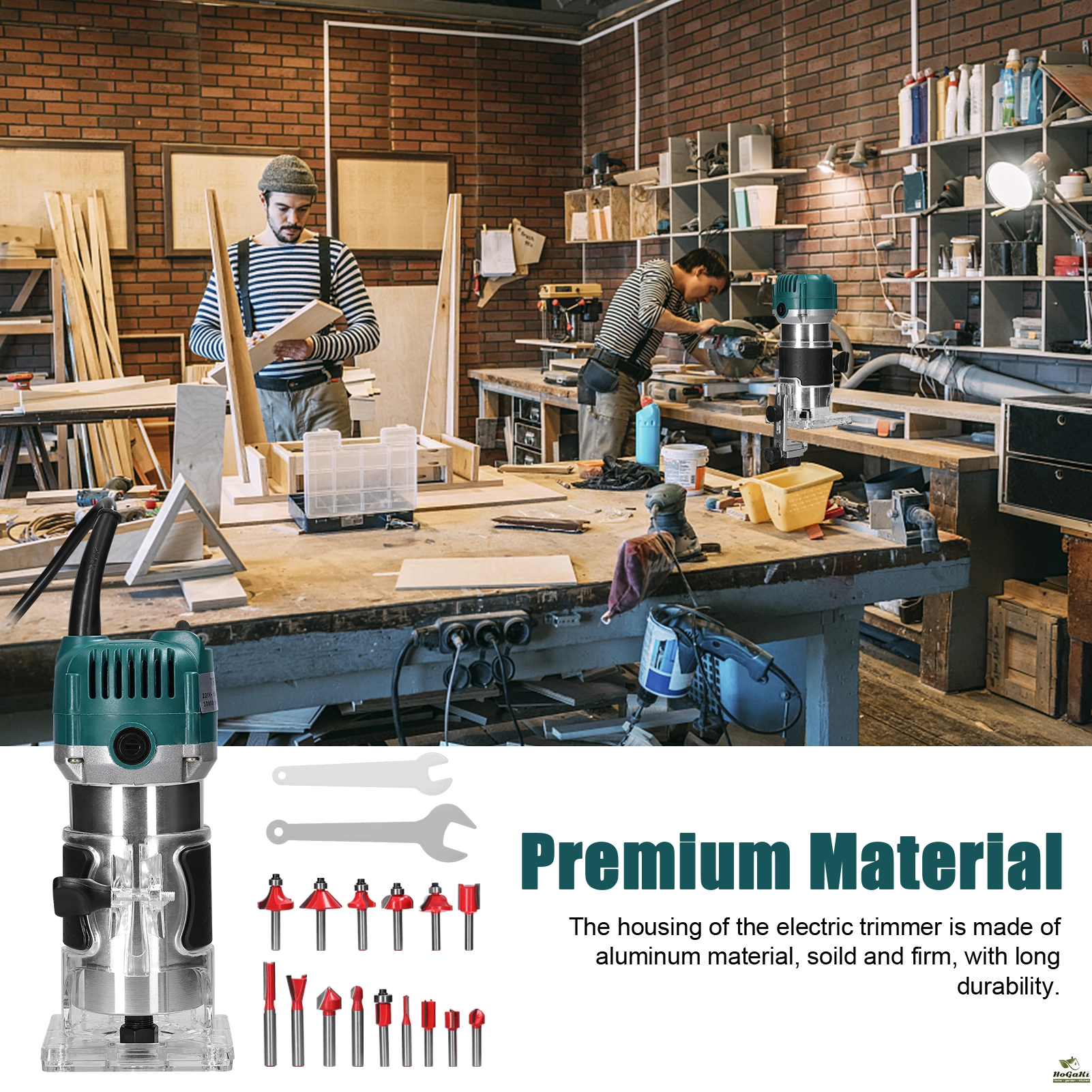 This electric trimmer can be used for wooden processing, cabinet processing, handicraft production and DIY. Easy for wood trimming, grooving and drilling. With transparent base, processing accuracy can be easily recognized. With tightness adjustment knob to precisely fix the tightness of the transparent cover. Comes with trim guide base and straight trim guide ruler, it can be more effective to assist in cutting straight lines, chamfers or grooving works. Equipped with 15 different types of milling cutters, it can carry out different kinds of trimming and shaping operations on wood or other materials to meet different processing needs and improve work efficiency. Suitable for wooden processing, cabinet processing, handicraft production, etc.