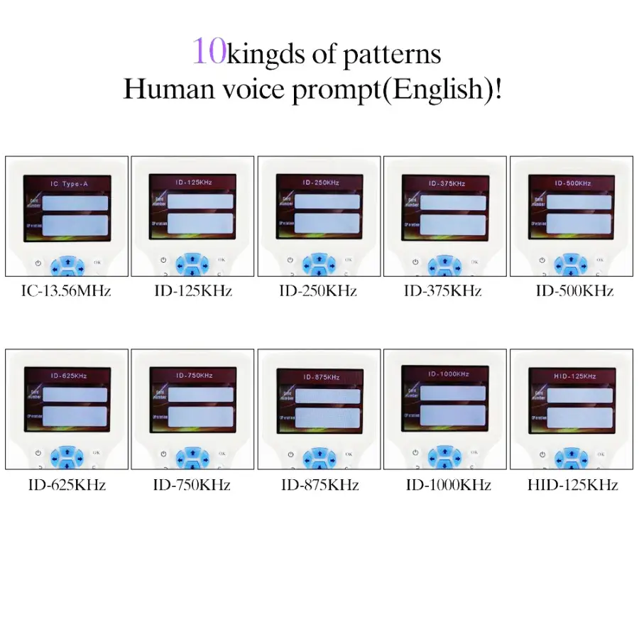 3) Support read write Frequency: 125KHz, 250KHz, 500KHz, 375KHz,625khz, 750kHz, 875KHz, 1000KHZ, 13.56MHz(ISO1443A/B),HID Prox cards.