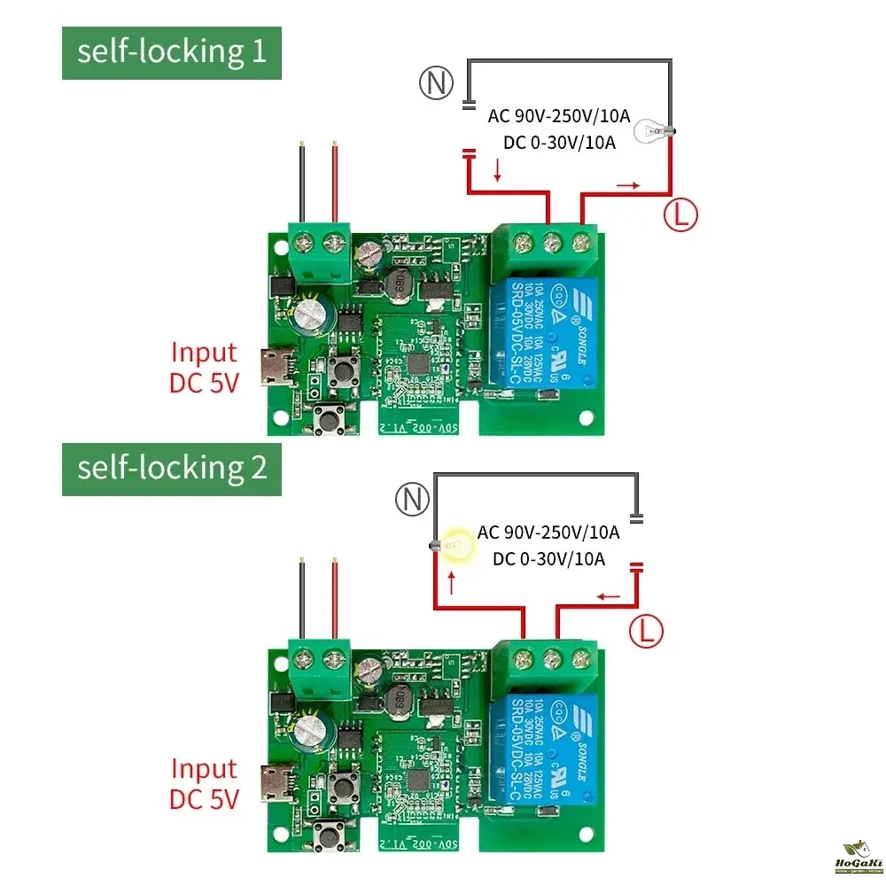 This product is a wireless switch supports inching /self-locking mode. Users can add the device to the APP eWeLink in order to remotely control connected home appliances or devices. In self-locking mode, customers can remotely turn on/off connected devices immediately. When in inching mode, customers can have two wiring ways to select: