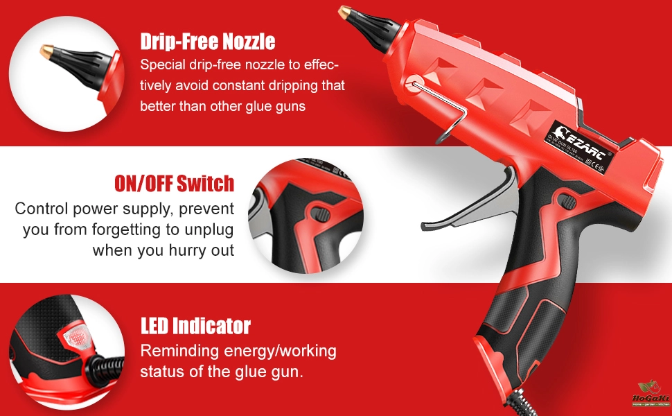 【Comprehensive Security】The new develop full size glue gun has a drip-free nozzle to effectively avoid the situation of drip during uses. Secure power switch with LED light mode makes the glue gun extremely user-friendly. Metal built-in stand helps keeps the gun upright when you’re not in use.