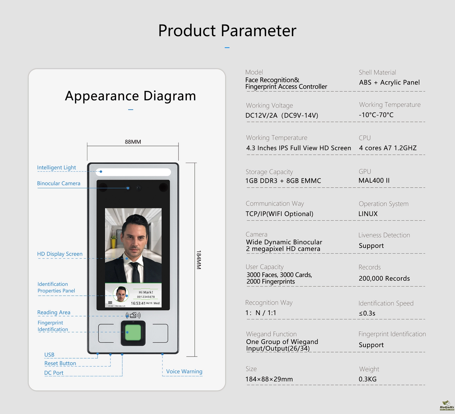 Recognition Mode: Face, Fingerprint, Password and Mifare Card