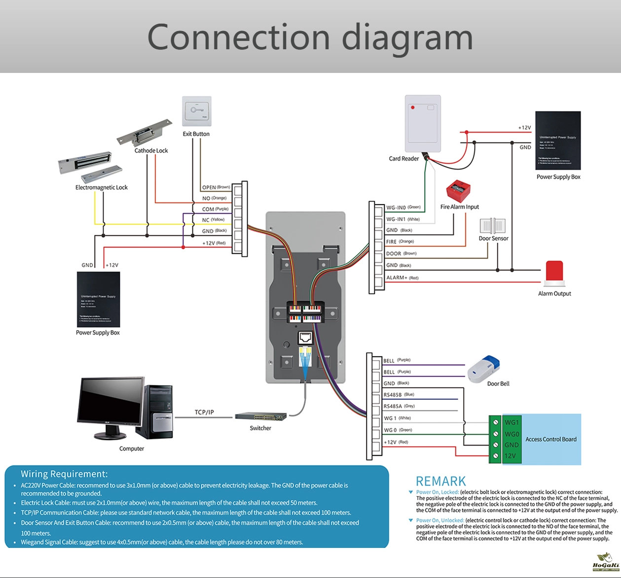 Other Interfaces: One Exit Button, One Door Sensor, One Fire Input, One Alarm Output, One Wiegand Output, One Wiegand Input , One Lock Control, One USB, One RS485