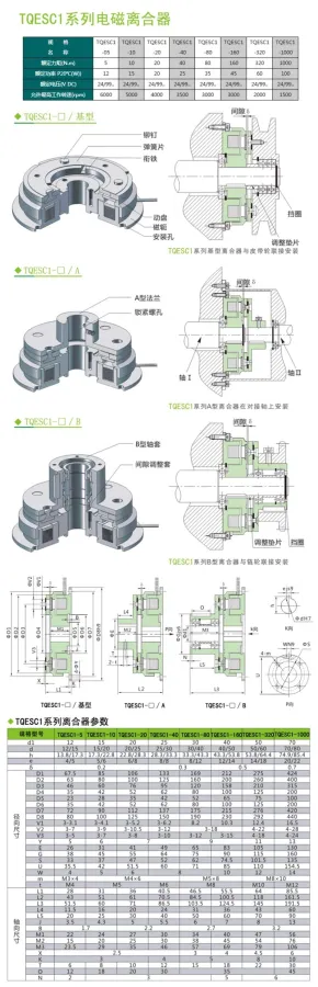 TQESC1 series and TQESC2 series electromagnetic clutches are used in transmission systems to achieve rapid integration and separation of active components and driven components, as well as variable speed, forward and reverse rotation, high-frequency operation, indexing, micro-movement, buffer start and braking, overload protection, etc. TQESB1 series electromagnetic brakes are used in transmission systems to achieve braking, brake maintenance, high-frequency operation, positioning, micro-movement, buffer braking, etc.