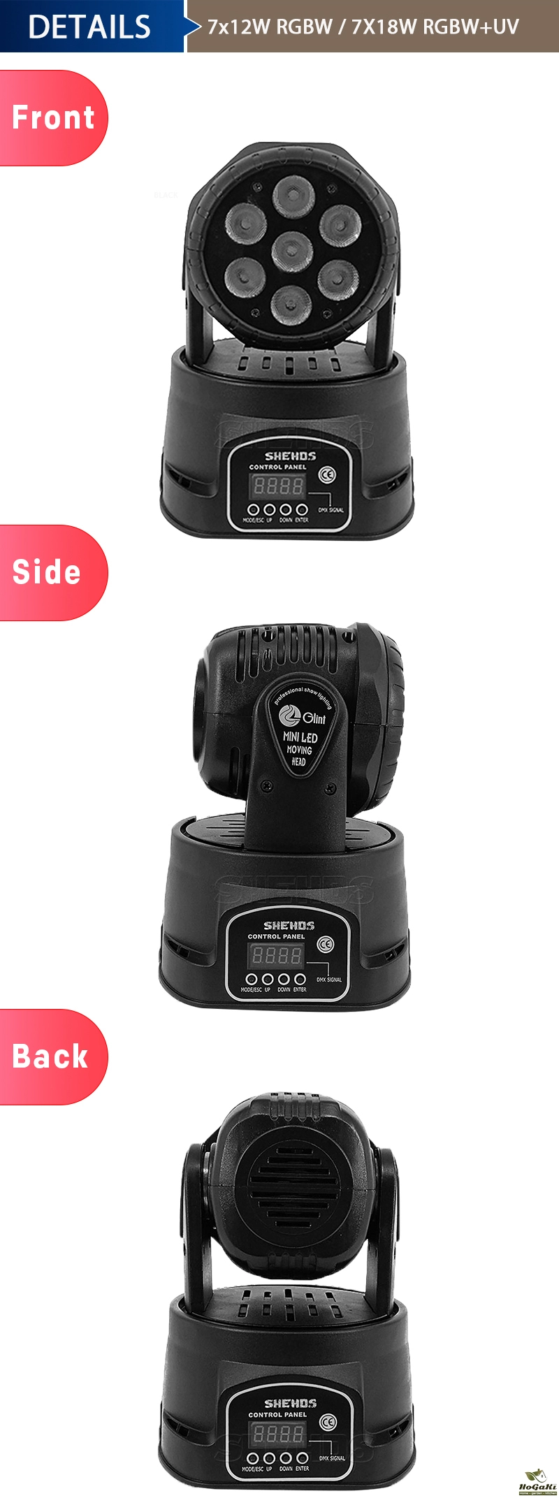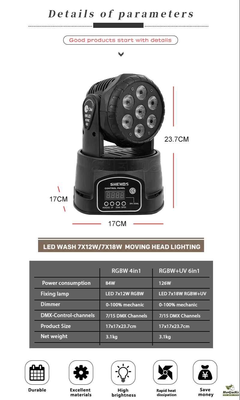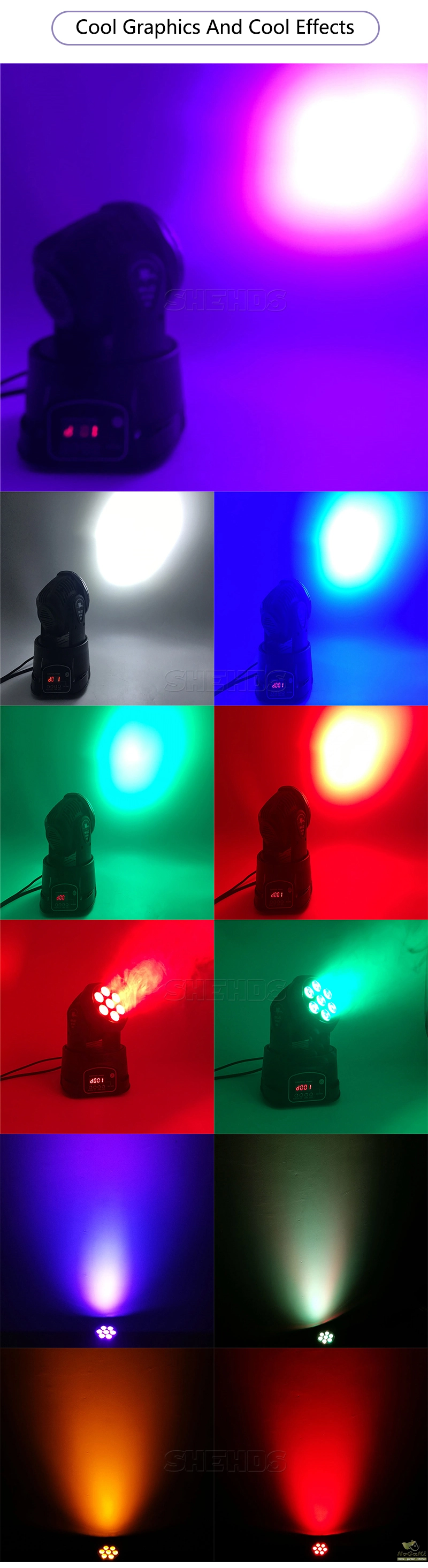 3.LED Source: 7x12W RGBW 4in1 Red,Green,Blue White.,7x18W RGBWA+UV 6in1Red,Green,Blue White ,Amber,Violet and mixed Color