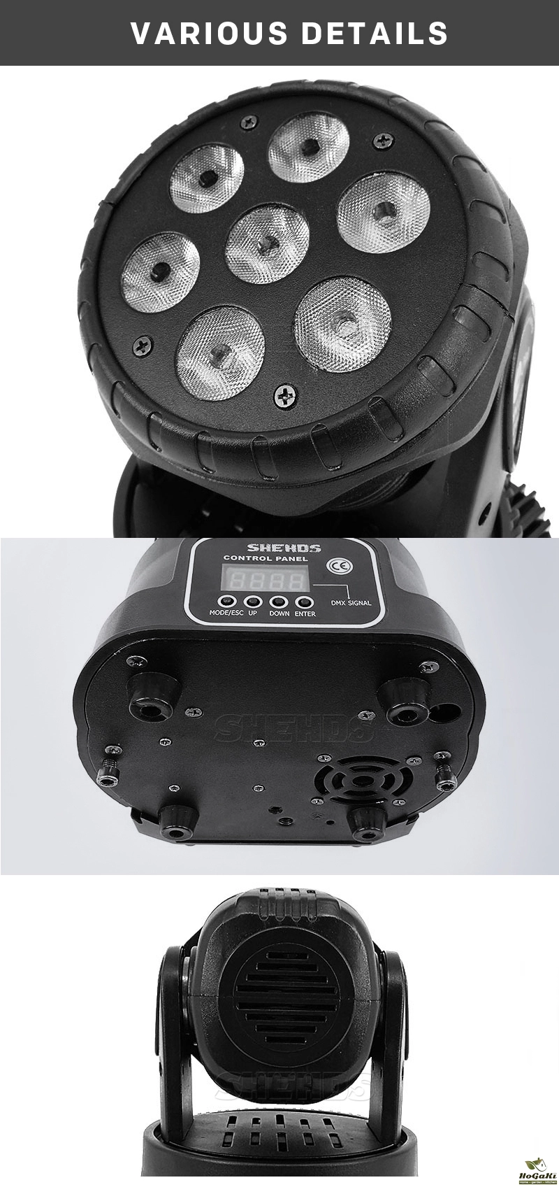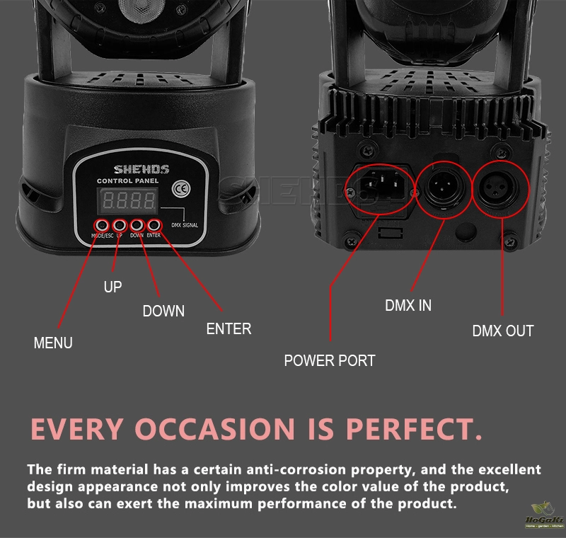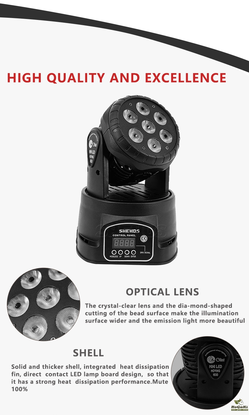 6.Control Mode:DMX512,Auto Run,Sound action,Strobe,Stand Aloneand/Master/Slave,With Rich Advanced Built-inPrograms