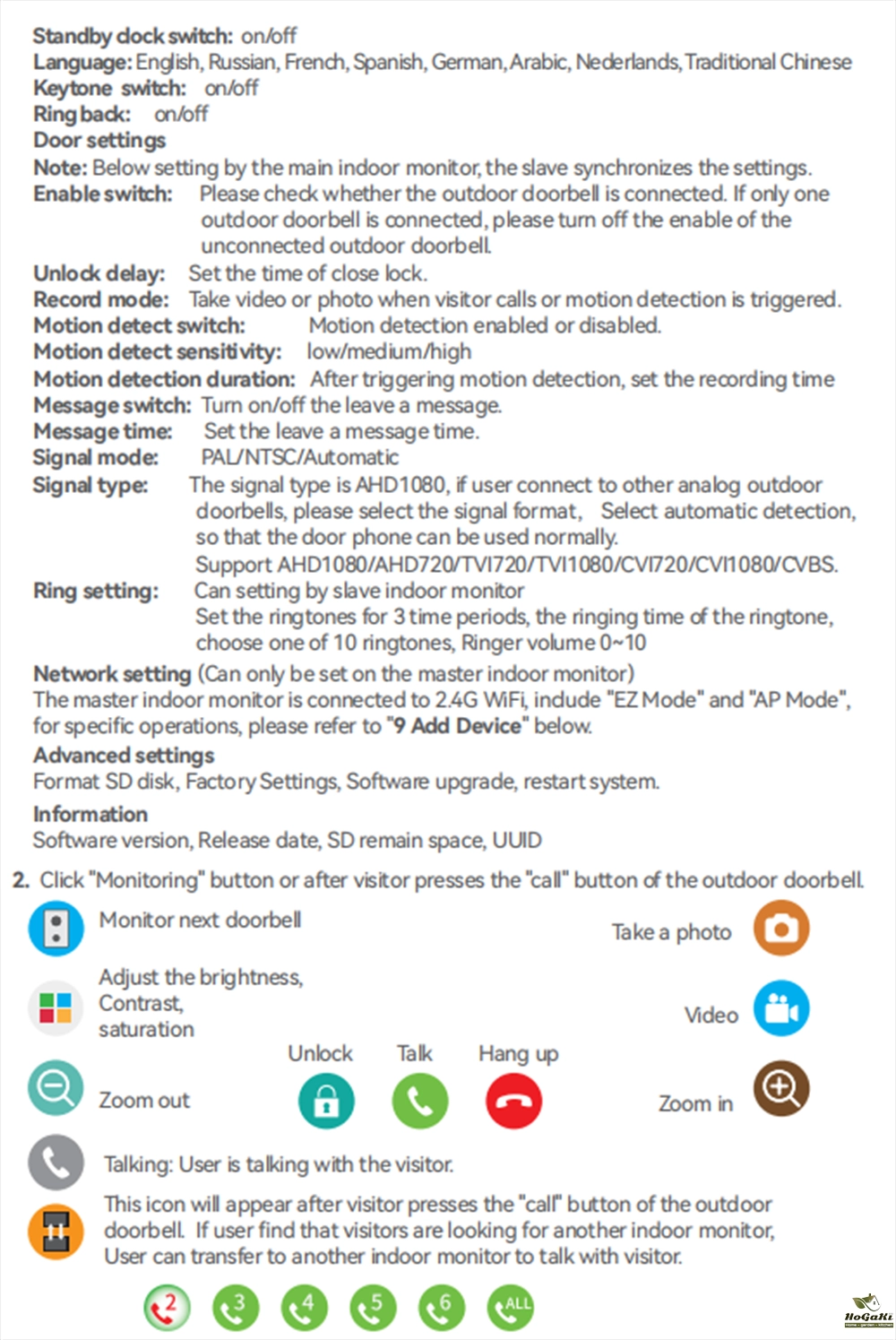 2-way communication between indoor and outdoor unit. Support 2 way communication between monitors.