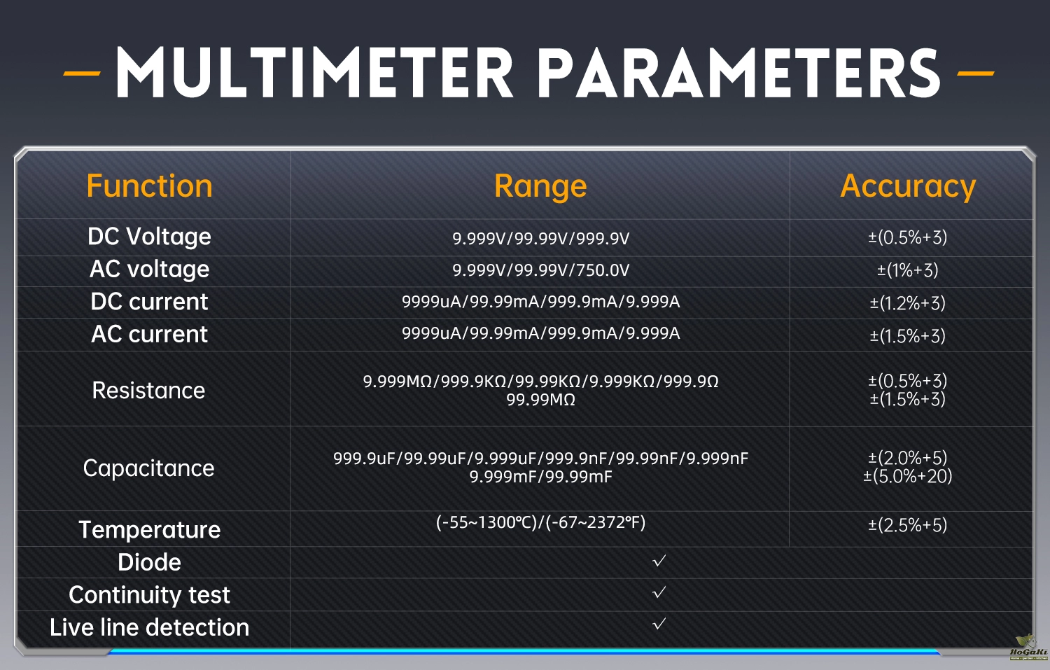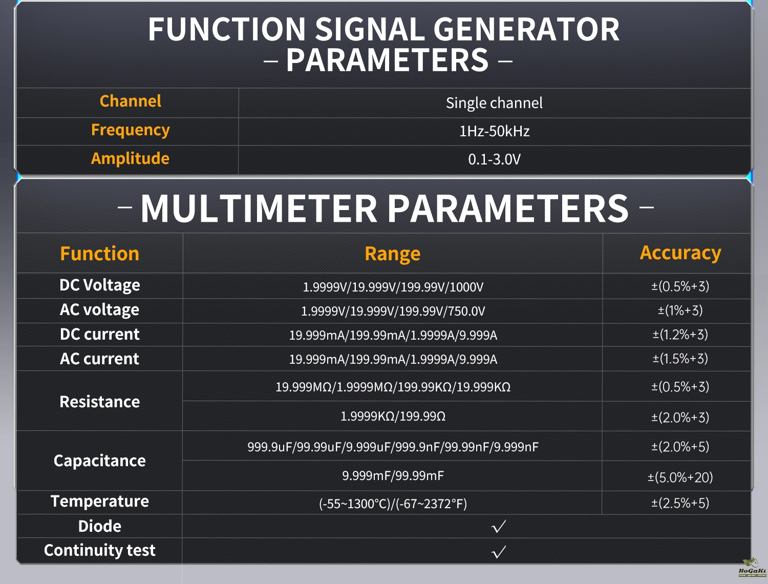 The multimeter in 2C23T offers 4-digit 10000-count true RMS, while 2C53T enhances it with 4.5-digit 19999-count true RMS, supporting AC/DC voltage and current, resistance, capacitance, diode, and continuity measurements.