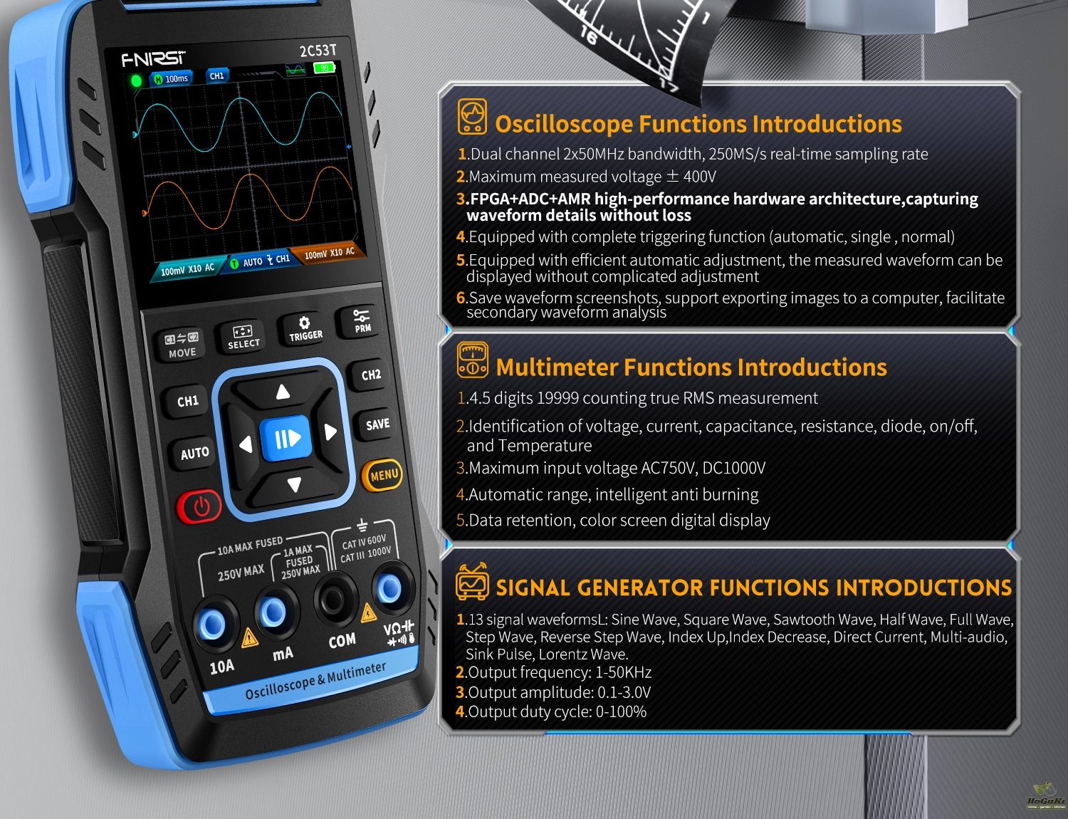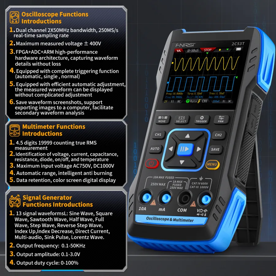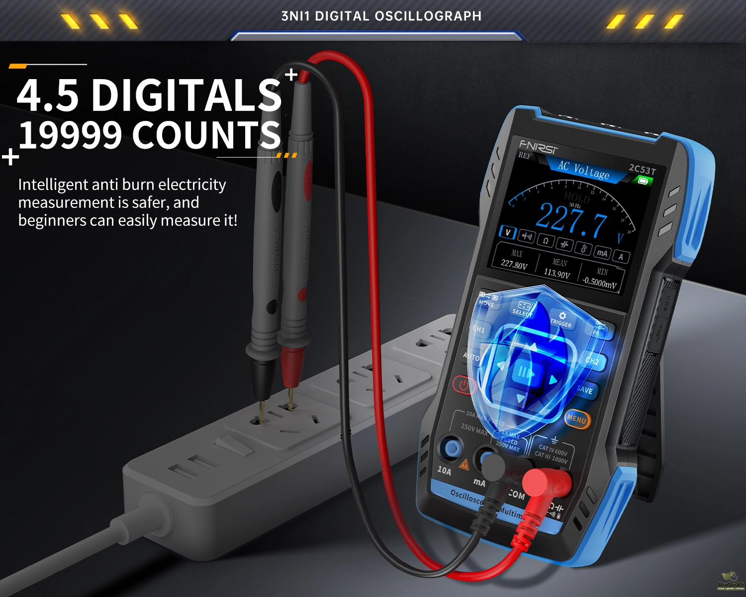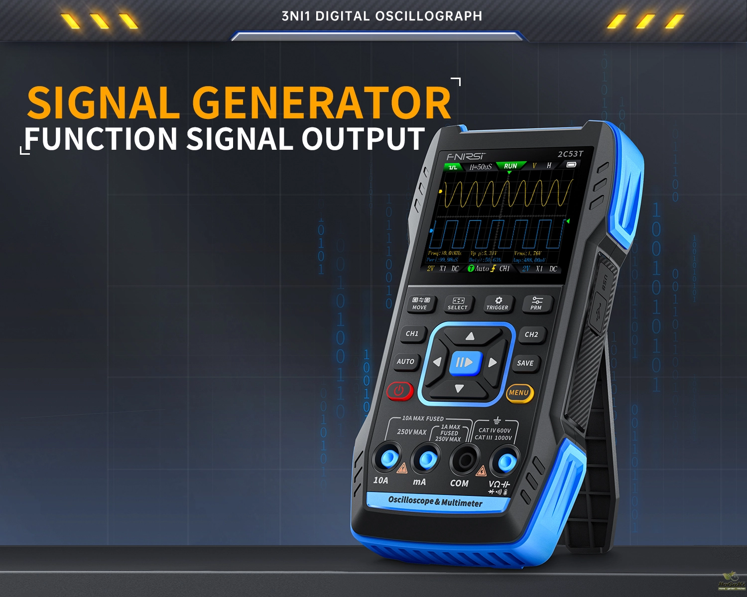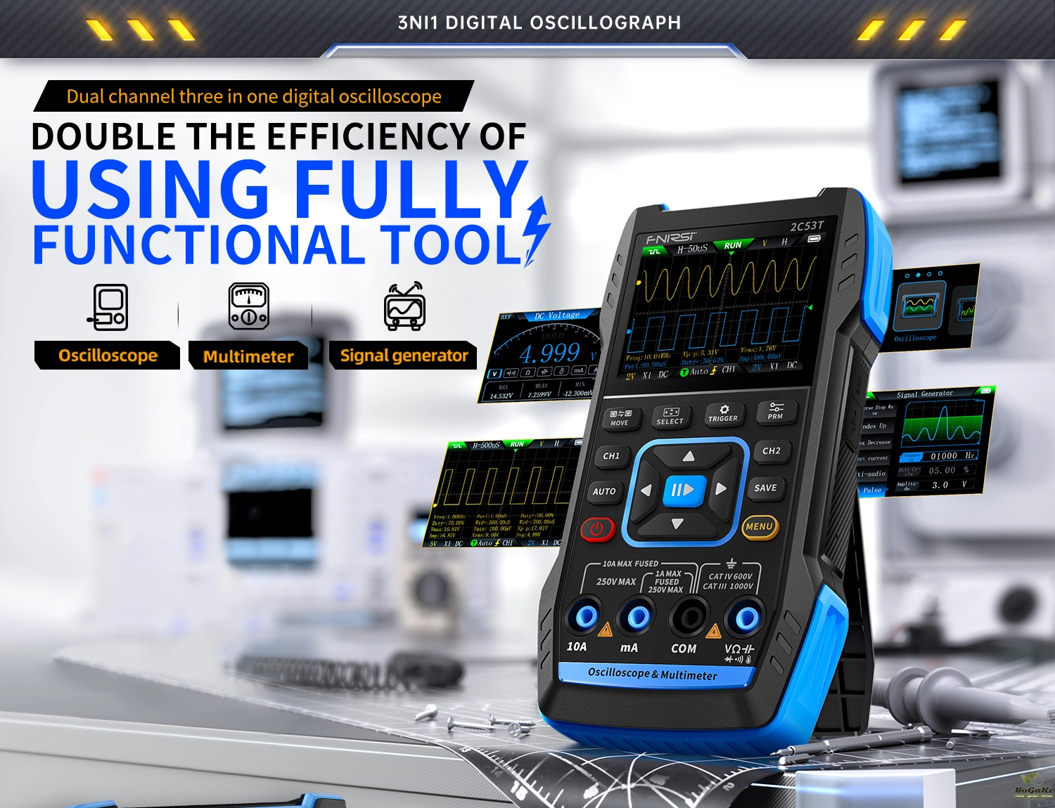 FNIRSI-2C23T & 2C53T are advanced 3-in-1 dual-channel digital oscilloscopes launched by FNIRSI, specially designed for professionals in maintenance, development, education, and home use. Compact yet powerful, both models integrate three essential functions: oscilloscope, multimeter, and signal generator—making them ideal for versatile testing needs.