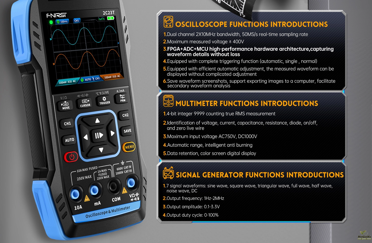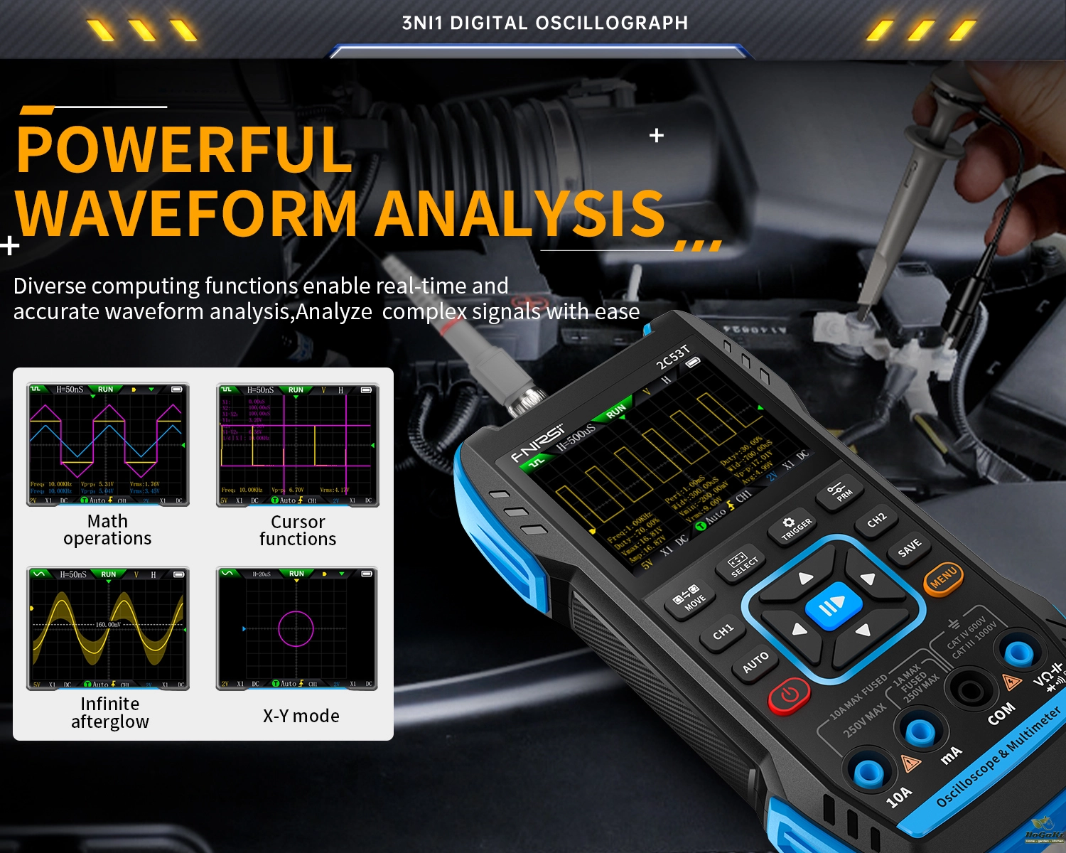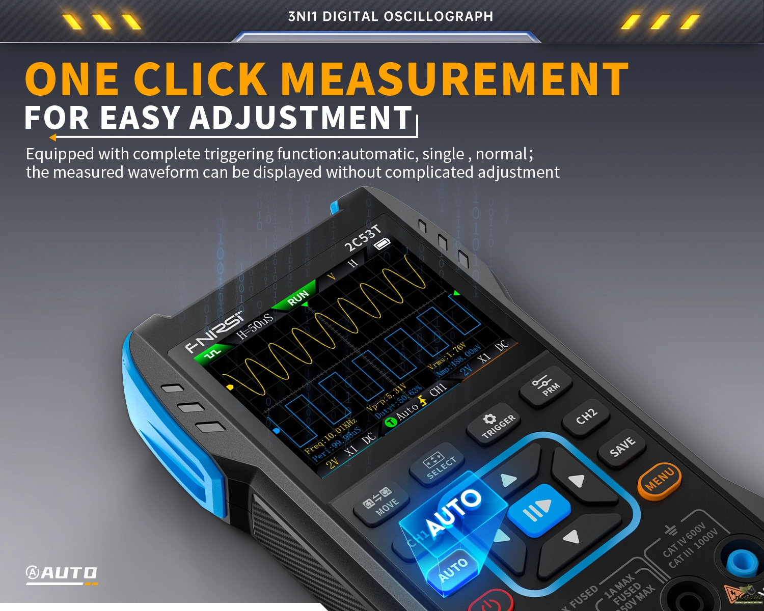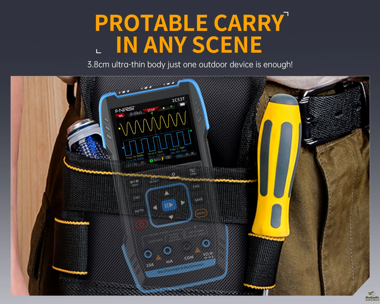 FNIRSI-2C23T & 2C53T are advanced 3-in-1 dual-channel digital oscilloscopes launched by FNIRSI, specially designed for professionals in maintenance, development, education, and home use. Compact yet powerful, both models integrate three essential functions: oscilloscope, multimeter, and signal generator—making them ideal for versatile testing needs.