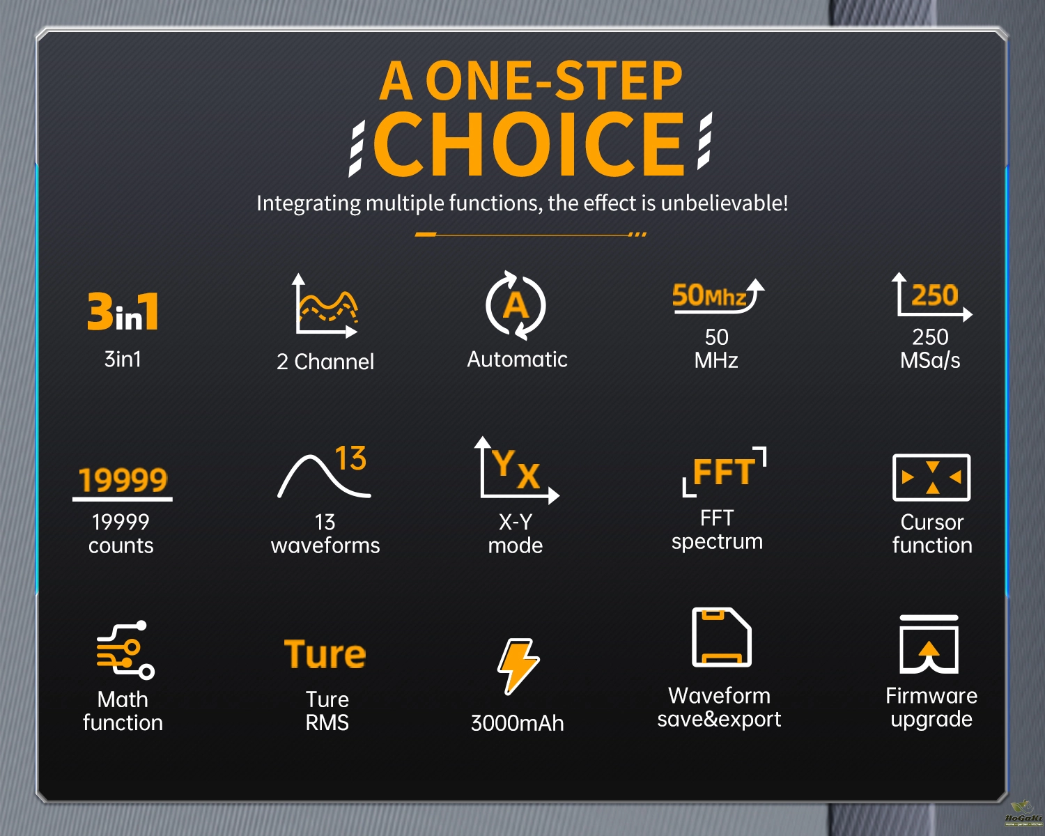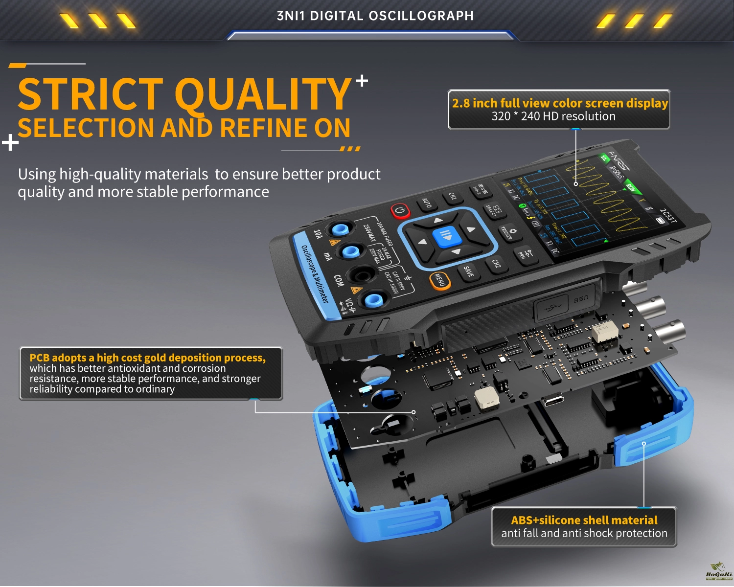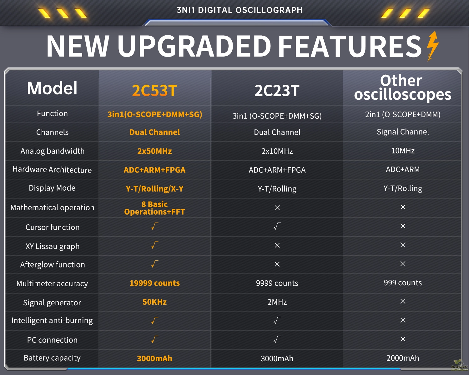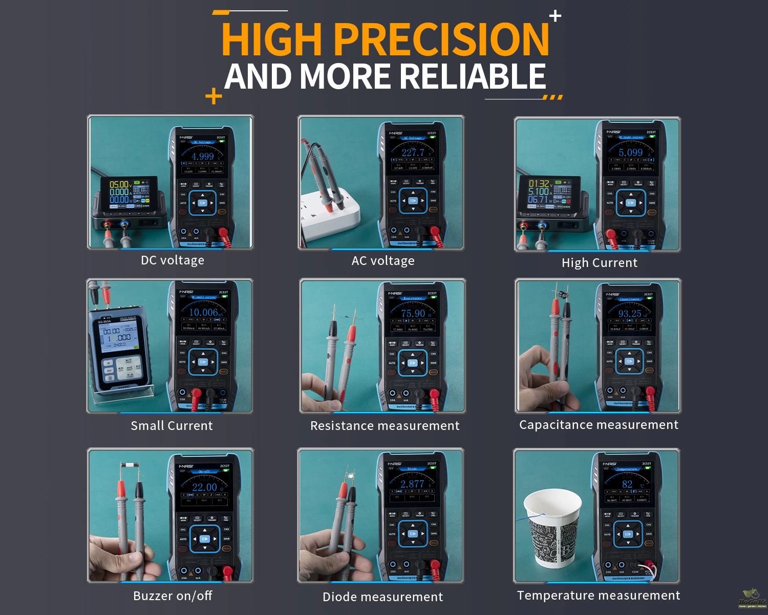 FNIRSI-2C23T & 2C53T are advanced 3-in-1 dual-channel digital oscilloscopes launched by FNIRSI, specially designed for professionals in maintenance, development, education, and home use. Compact yet powerful, both models integrate three essential functions: oscilloscope, multimeter, and signal generator—making them ideal for versatile testing needs.