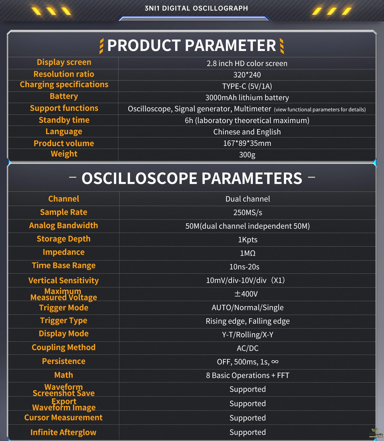 Each model is equipped with a 2.8-inch 320×240 HD display and a 3000mAh rechargeable battery, delivering up to 6 hours of standby time. With waveform screenshot saving and viewing support, these devices combine portability, power, and practicality in one tool.