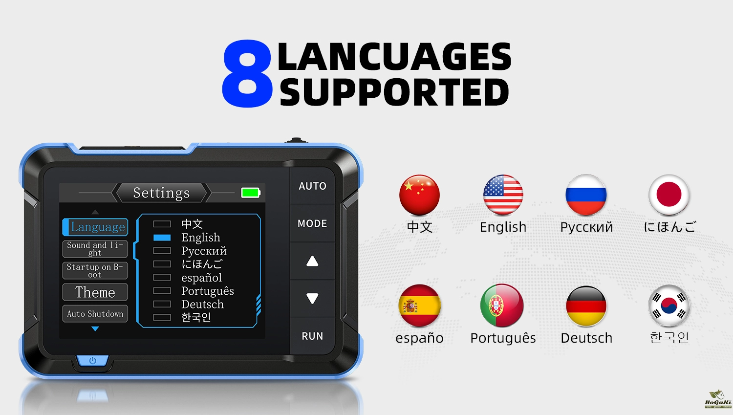 8 different languages: Chinese, English, Russian, Japanese, Spanish, Portuguese, German, Korean