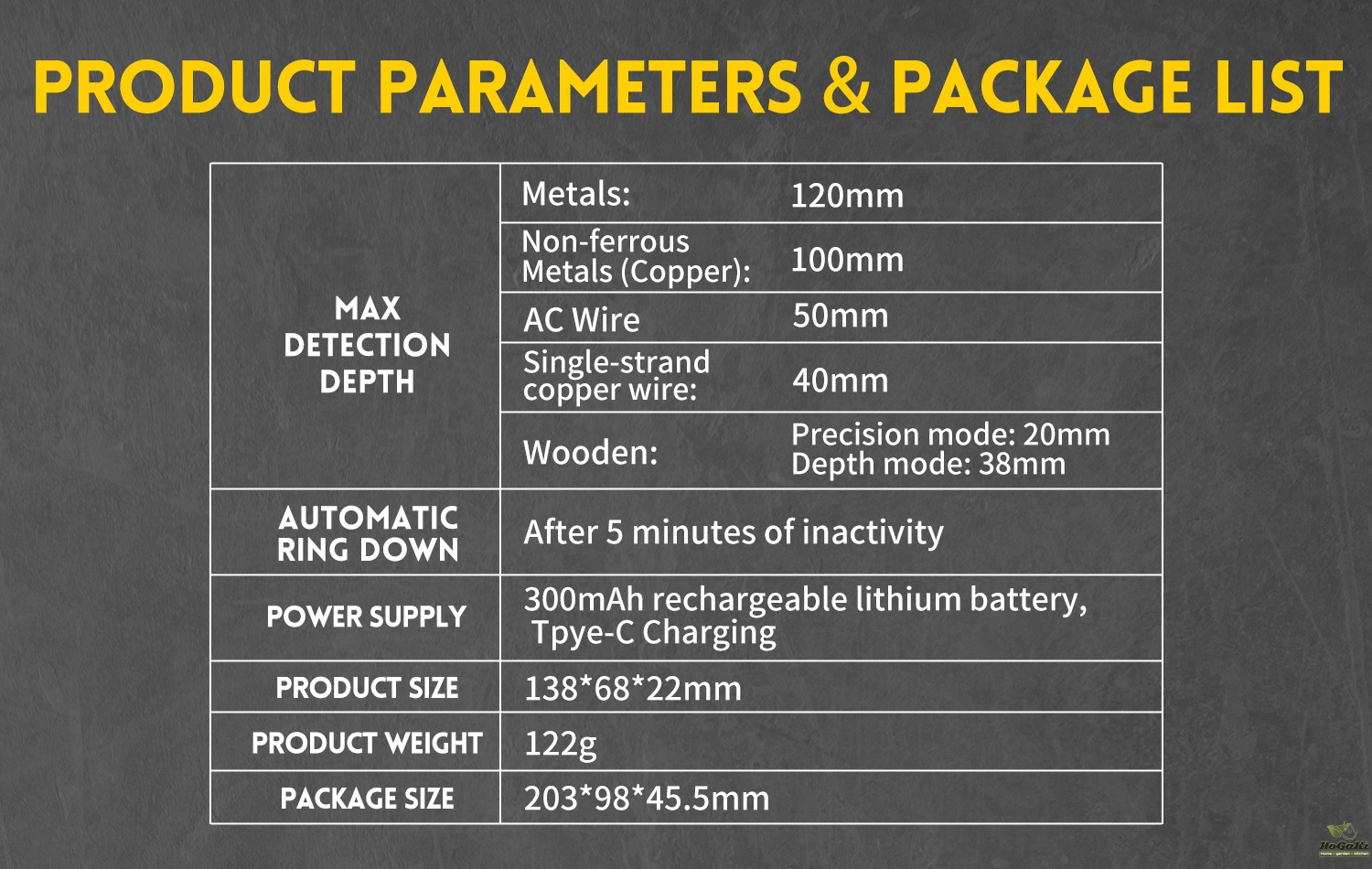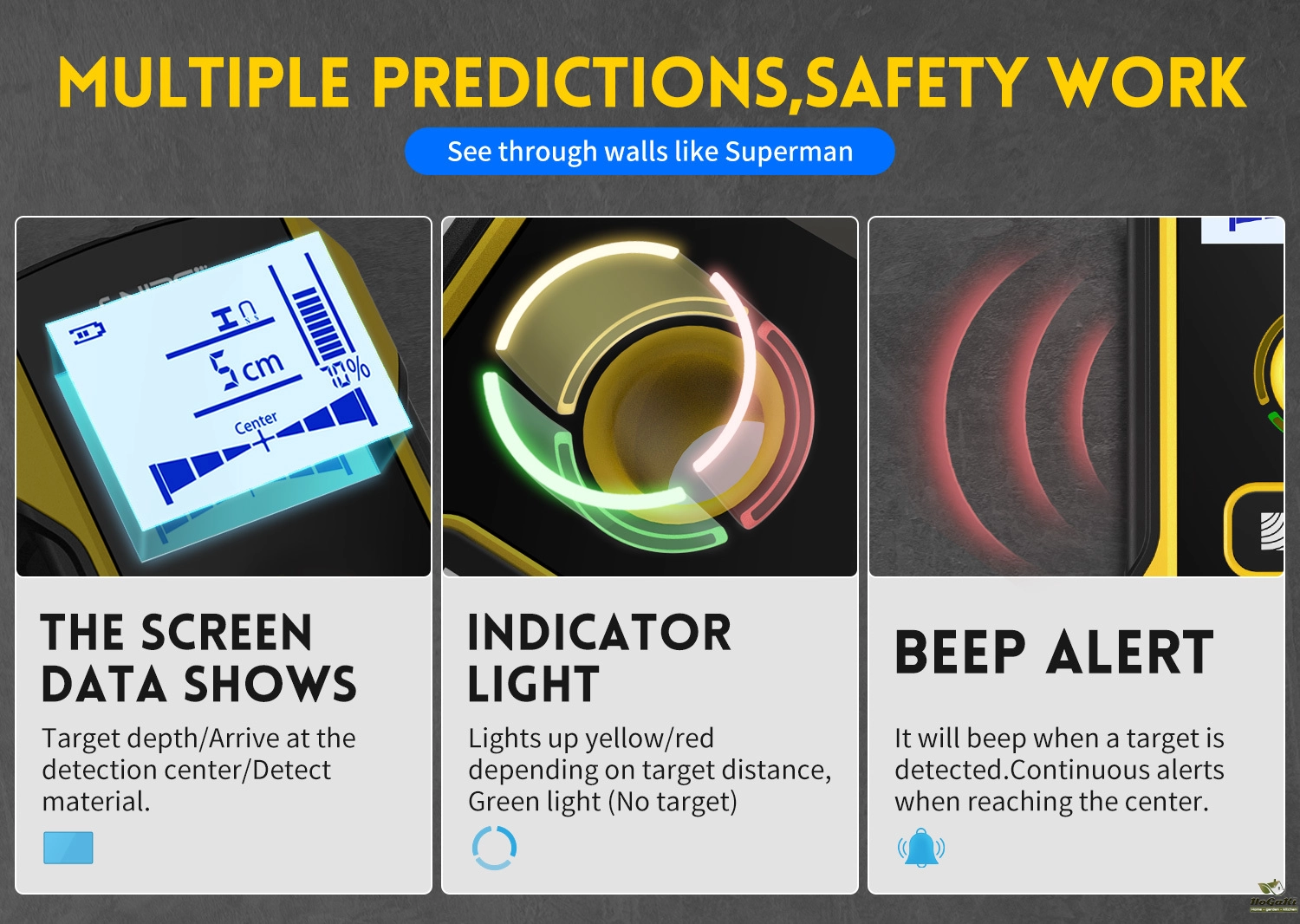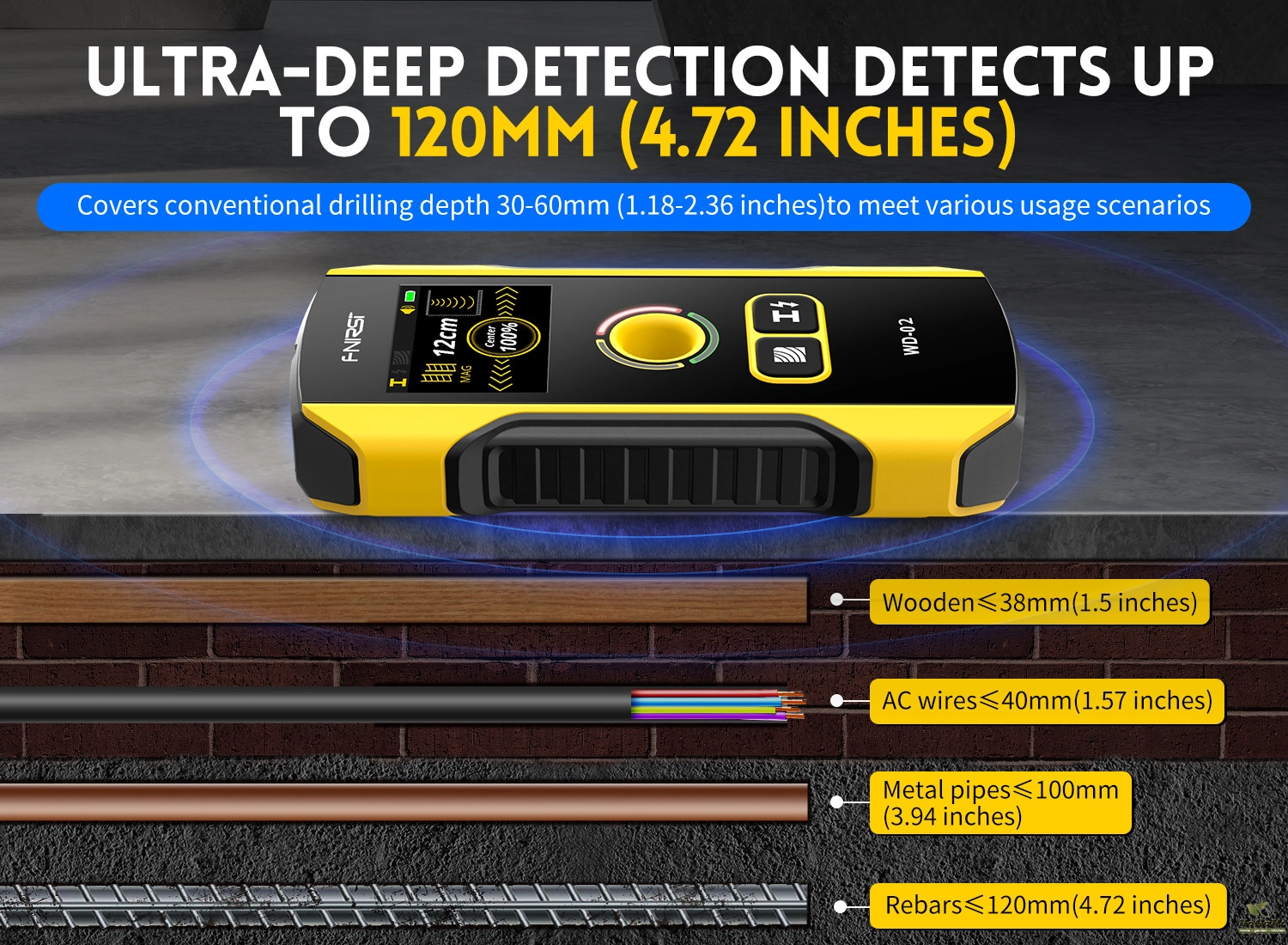 This wall detector scanner can help you to quick locate edges and center metal, studs, joists, pipes and live AC wire behind walls, floors and ceiling. The measuring ranges of wooden is ≤38mm, AC wires ≤40mm, metal pipes ≤100mm and rebars ≤120mm.
