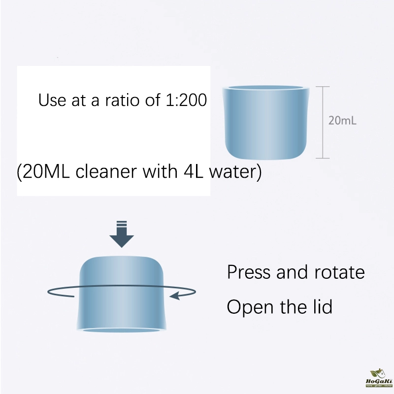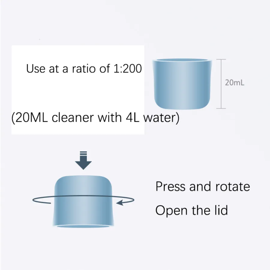 First step:Please follow the dilution ratio of 1:200, (1 bottle cap is about 20mL, suitable for about 4L of water) after shaking evenly, you can use it.