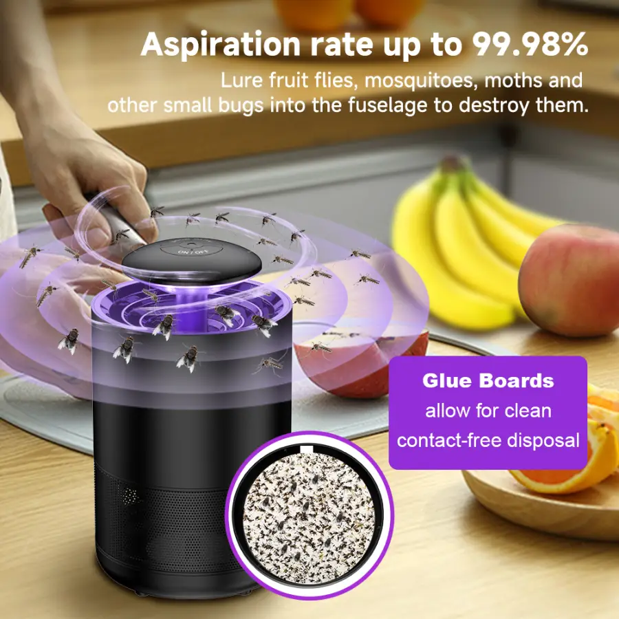 The indoor fly trap emits long-wave light in the 365 nm to 395 nm range. This light is highly attractive to insects due to their sensitive retinas. Once attracted, a fan draws the insects into the trap, and the strong sticky glue ensures effective trapping, ultimately collecting them in a mosquito storage box. Physical pest control is safe for every household member.