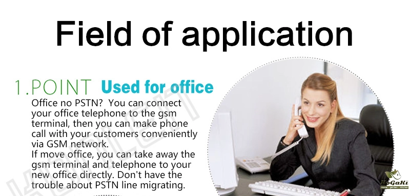 1. Used for office: Office no PSTN? You can conenct your office telephone to the gsm terminal, then you can make phone call with your customers conveniently via gsm network. If move office, you can take away the gsm terminal and telephone set to your new office directly. Don't have the trouble about PSTN line migrating.