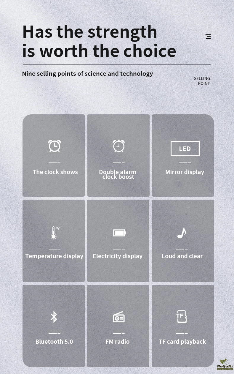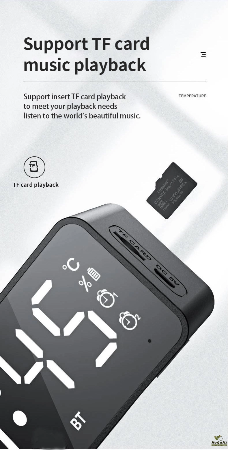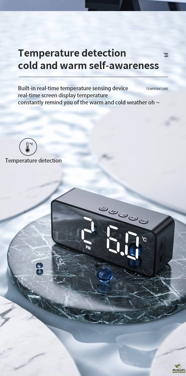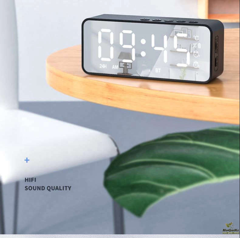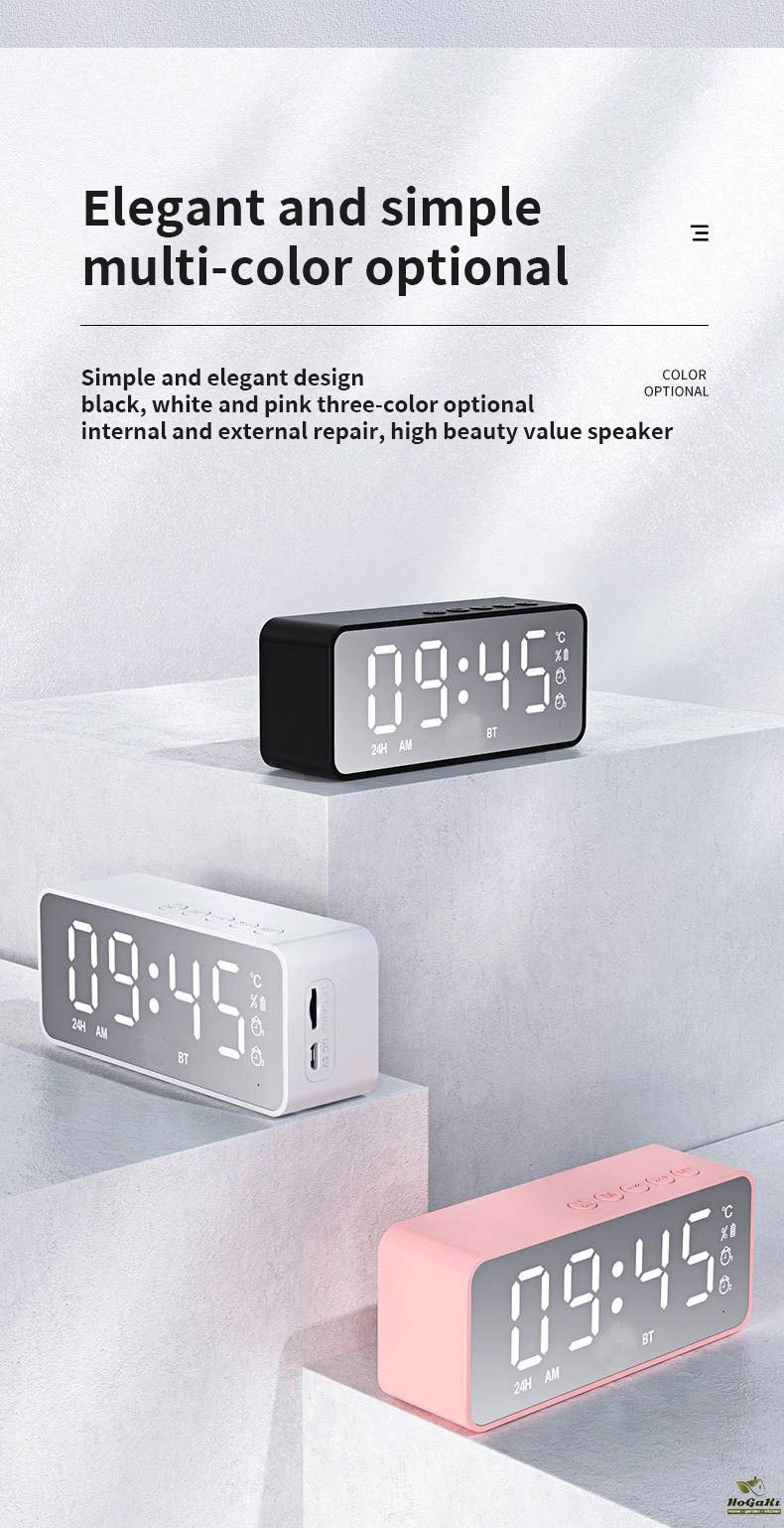 • FM Mini Card Mirror Alarm Clock :The speaker doubles as an alarm clock, with an FM mini card mirror that can be used as a backup.