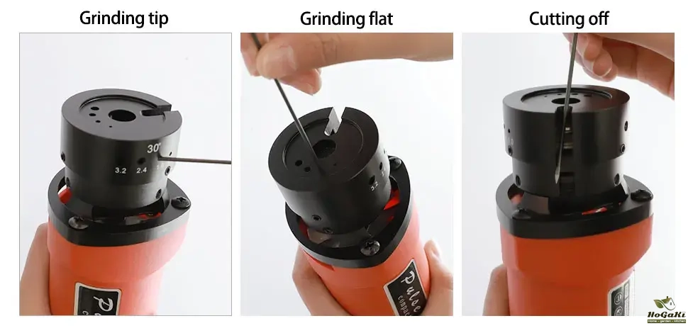 Grinding tip:Inserting tungsten electrode pole into suitable diameter(1.0/1.6/2.4/3.2mm)hole as desired angle (22.5°/30°);slowly rotating tungsten electrode pole to grinding the top of tungsten electrode pole evenly through