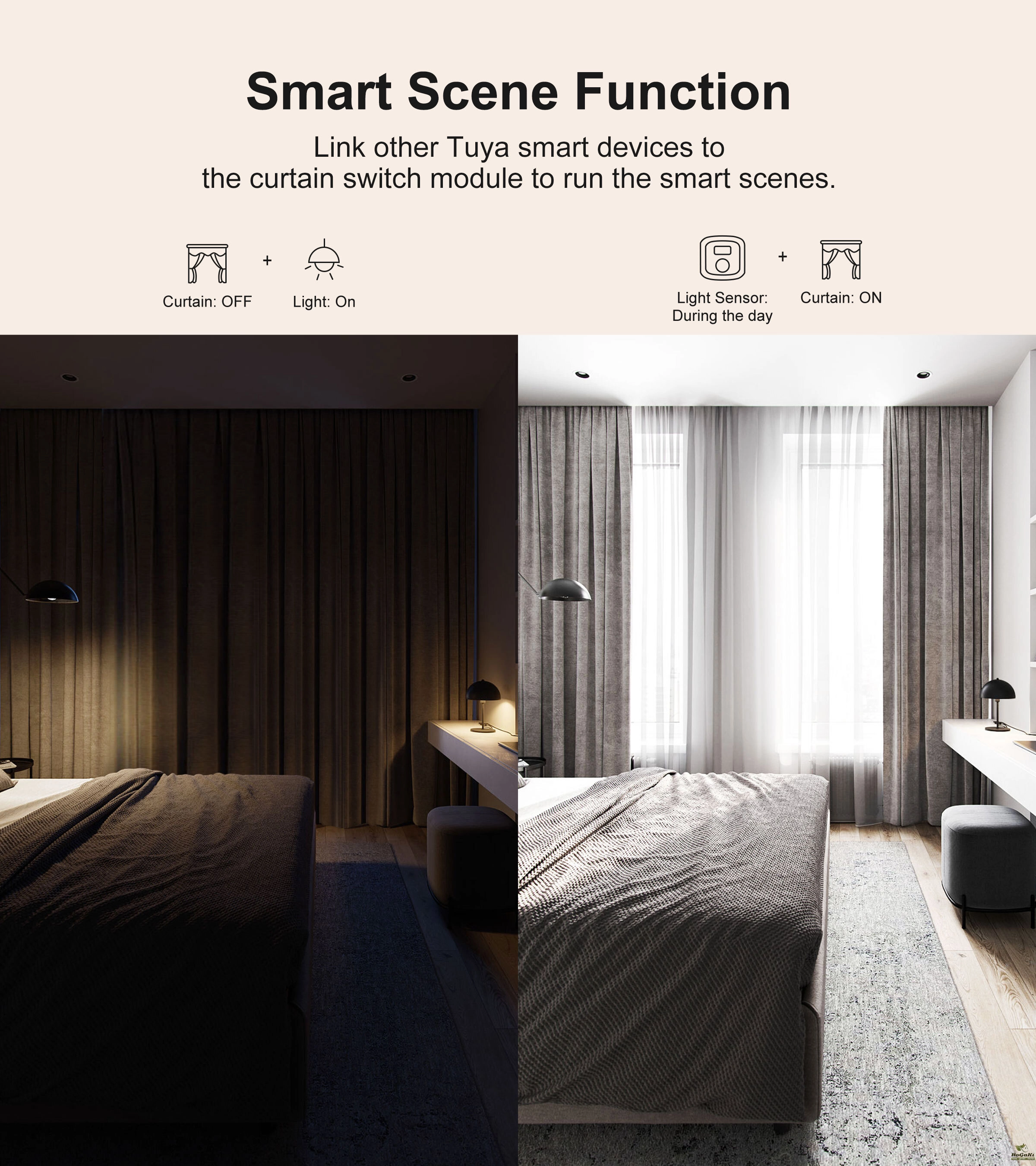 Link other Tuya smart devices to the curtain switch module to run the smart scenes.