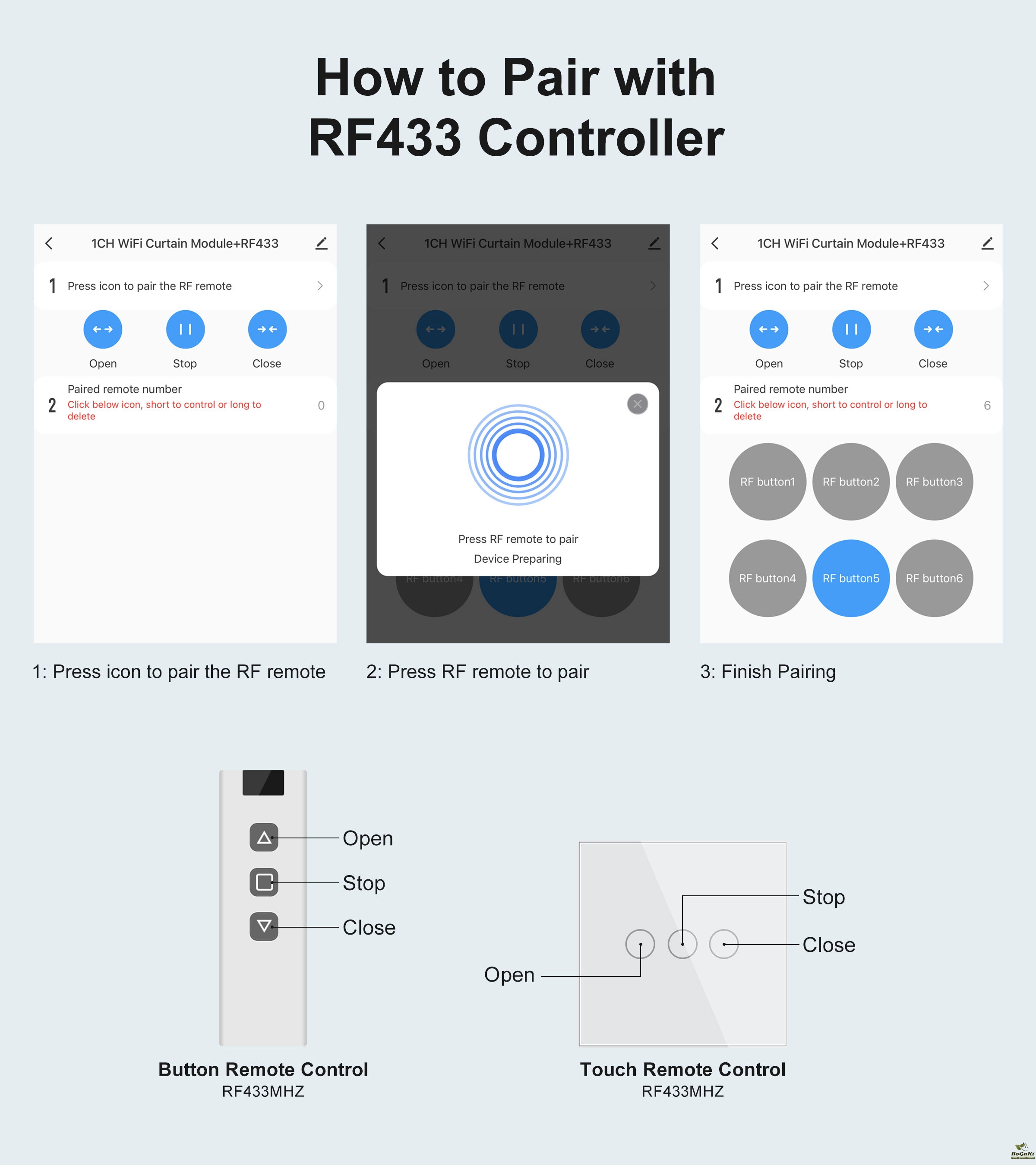 Not only support app remote control,but also work with RF433(1527 encoding) controller/transmitter,whether you use app or controller,you can remote control the curtain conveniently.