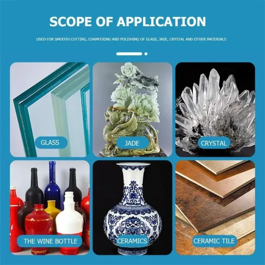 1.For smooth cutting, chamfering and grinding of glass, jade, crystal, wine bottle, ceramics, ceramic tiles and other materials.