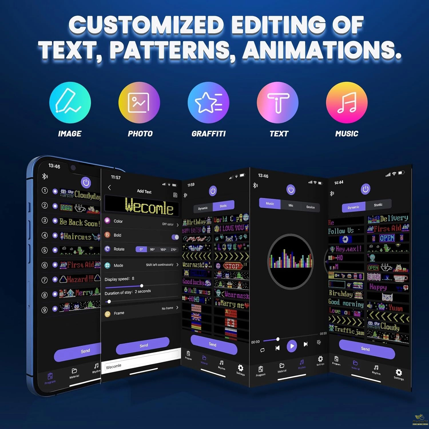 1.The programmable LED sign is controlled by a Bluetooth connected app, which can customize text, patterns and animations! You can design your own exclusive pattern and logo according to your own creativity and ideas, which greatly increases the widespread use