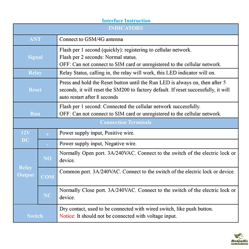 One output with relay (3A/240VAC)for connecting the switch of the door or machines
