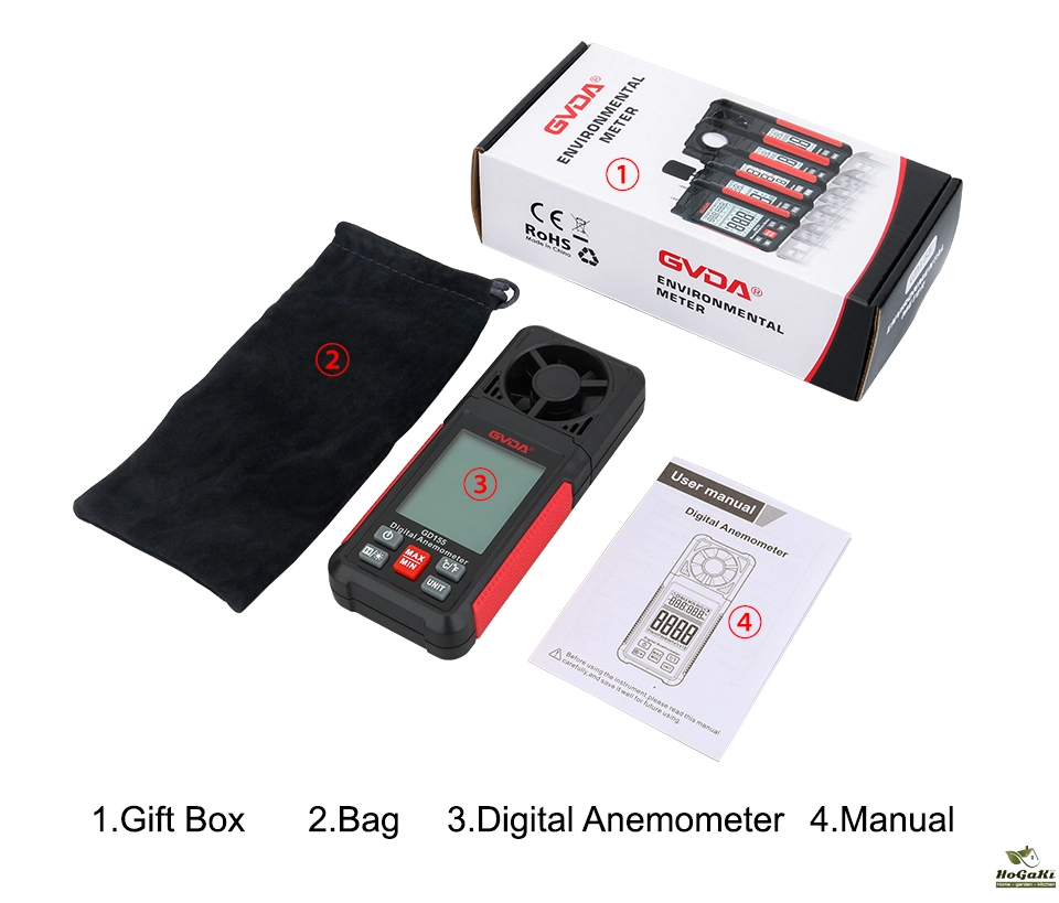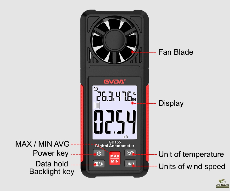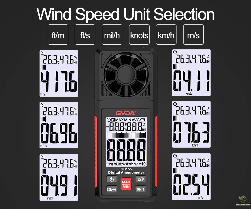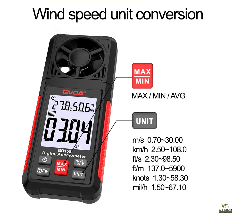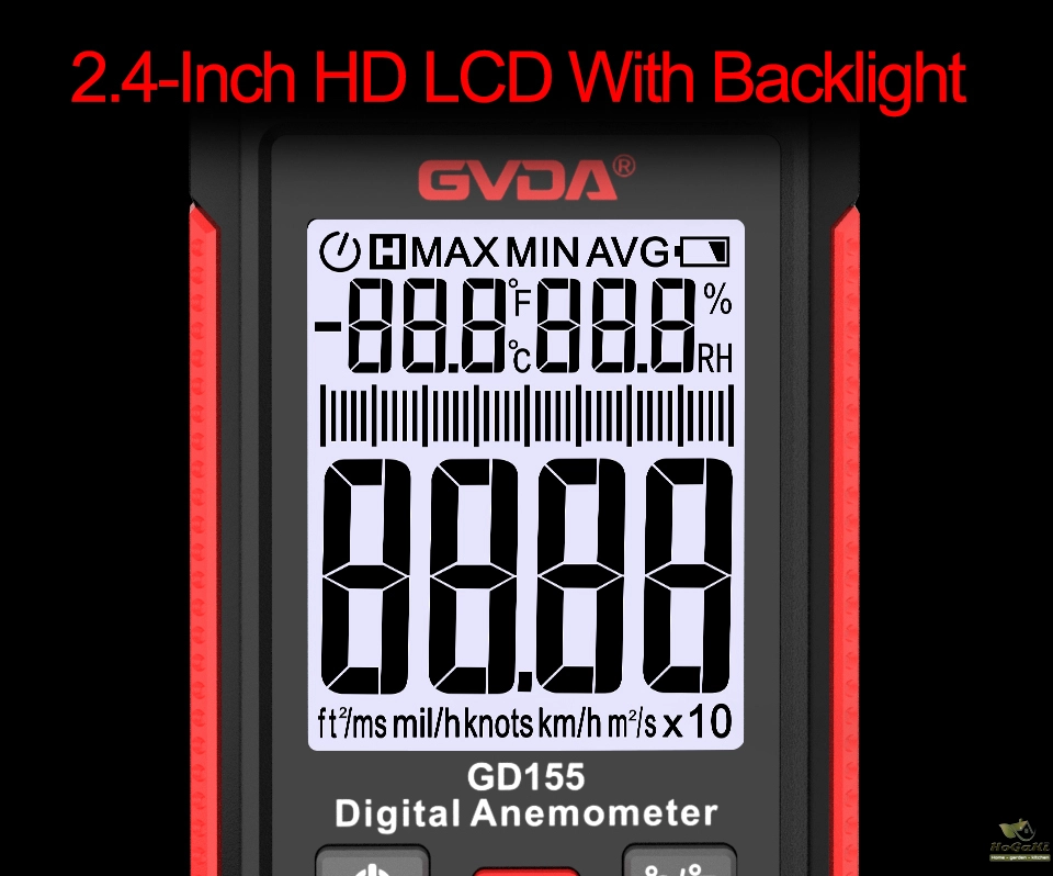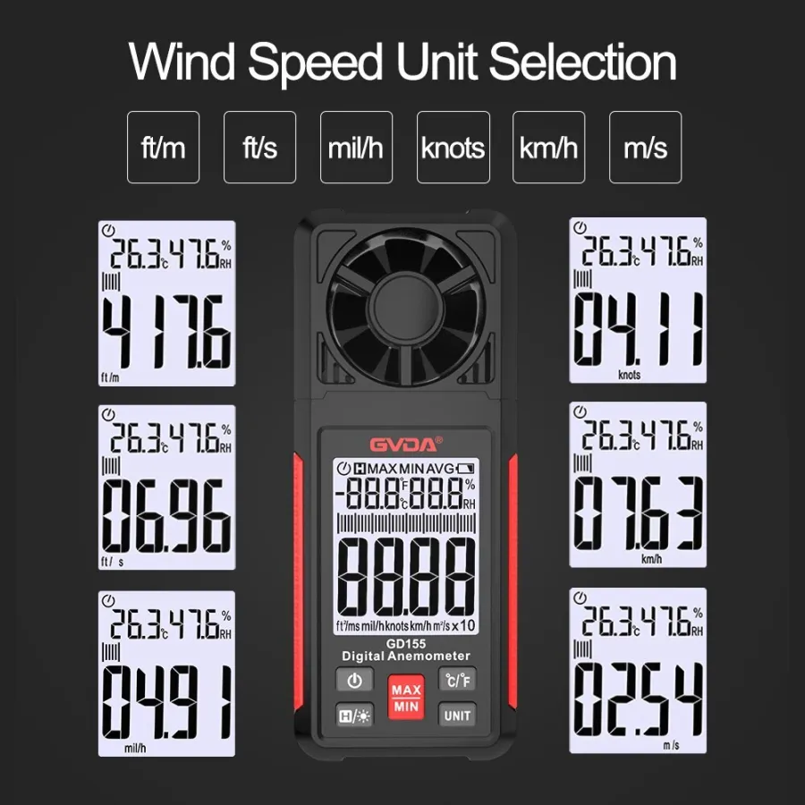 GVDA Digital Anemometer Portable Wind Speed Meter Air Velocity Gauge Windmeter LCD Backlight Display Temperature Humidity Meter