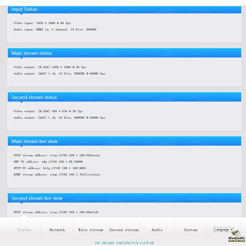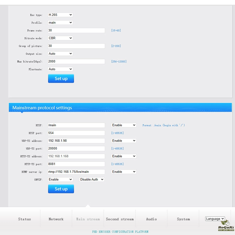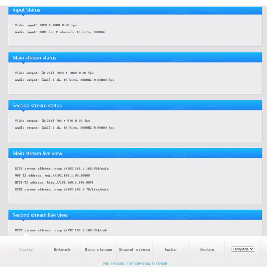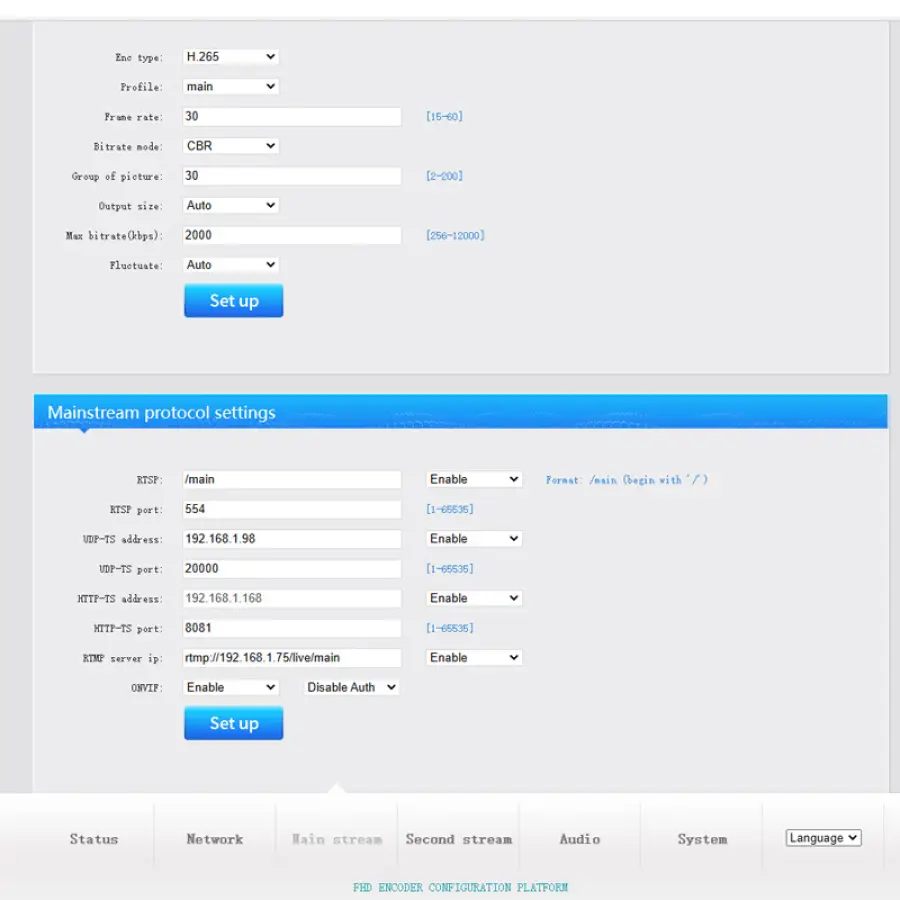 4. Support output 1 main stream and 1 sub stream to different Media Server at the same time.
