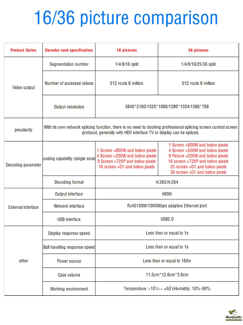 Single screen (card) decoding capability: 1 channel 800W, 4 channels 400W, 9 channels 200W, 16 channels D1