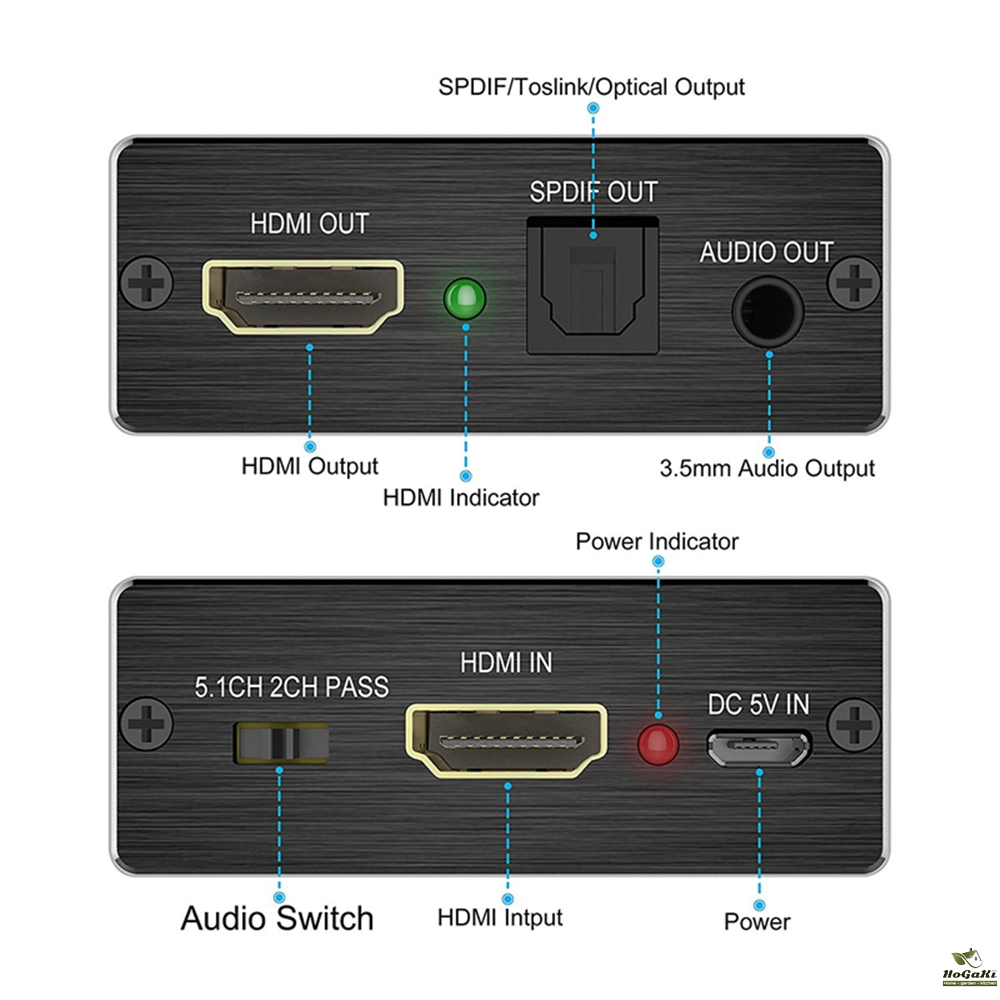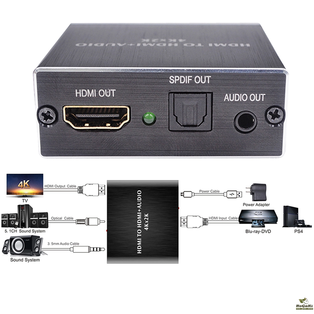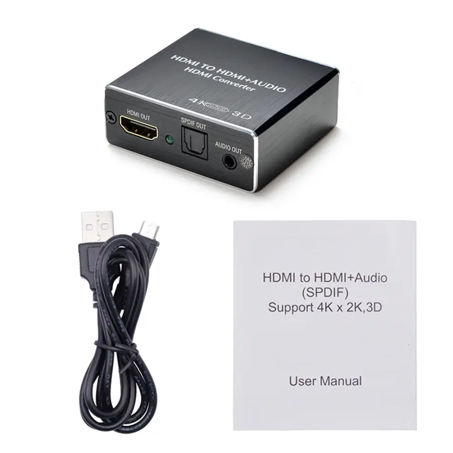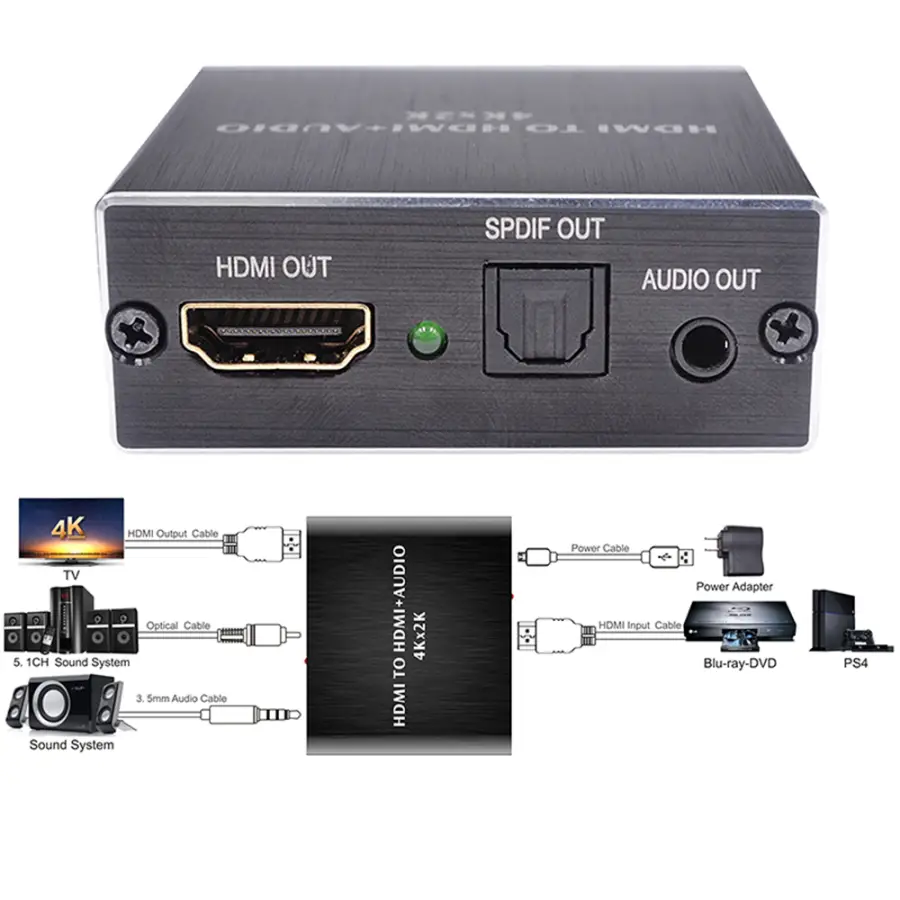 This hdmi audio splitter extracts embedded audio signals from an hdmi source and converts them to both a 3.5mm analogue audio output and a spdif output. The spdif output supports both 2 ch audio and 5.1 ch audio, including Dolby Digital 5.1 ch and dts 5.1 ch!