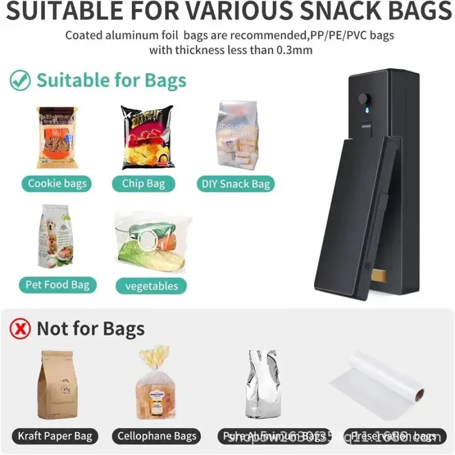 4. Suitable for all kinds of plastic bags: The food sealing machine can handle all kinds of plastic bags, such as snack bags, aluminum foil bags, potato chip bags and various PVC materials.