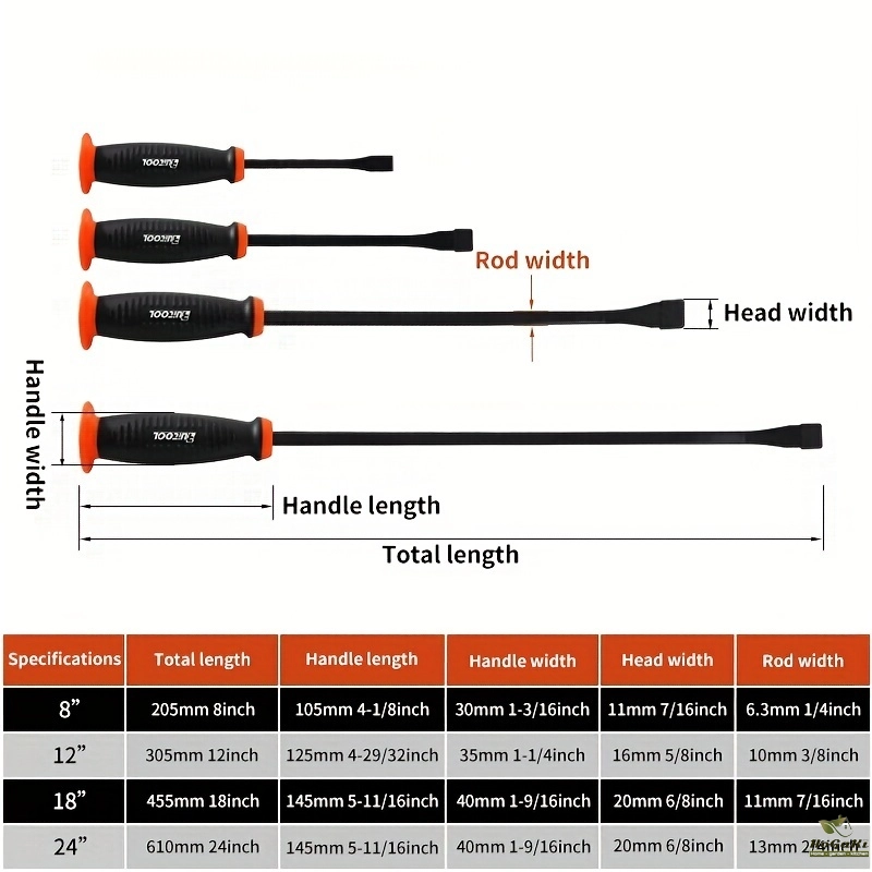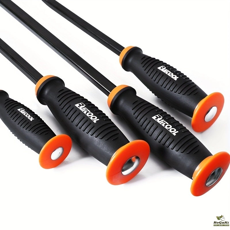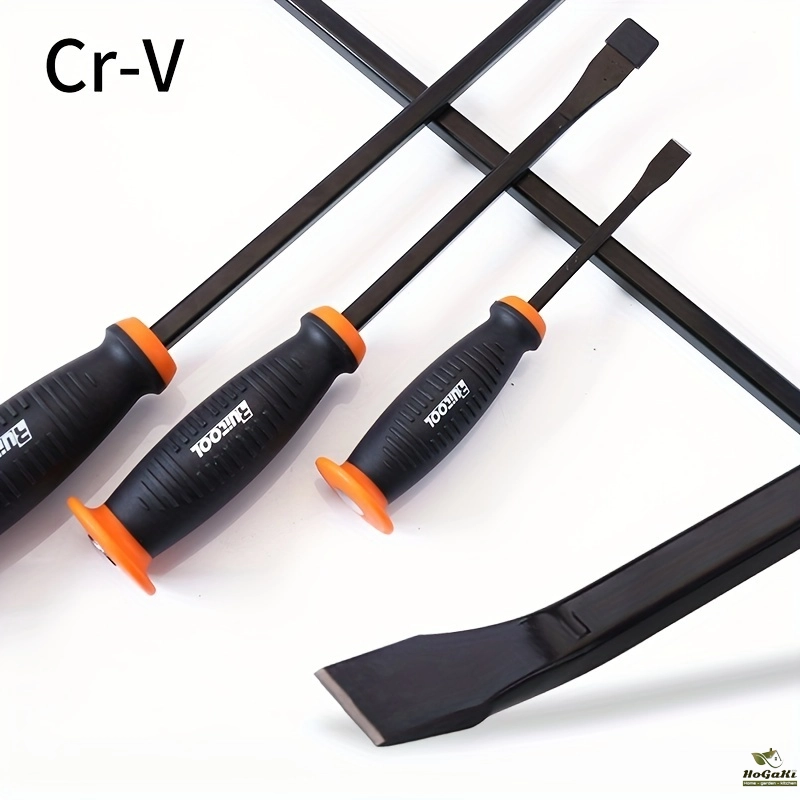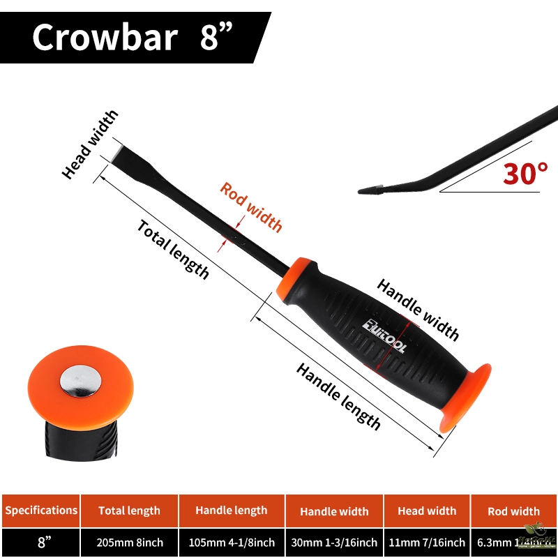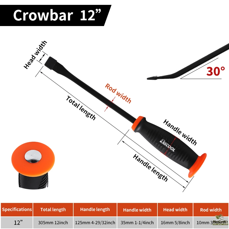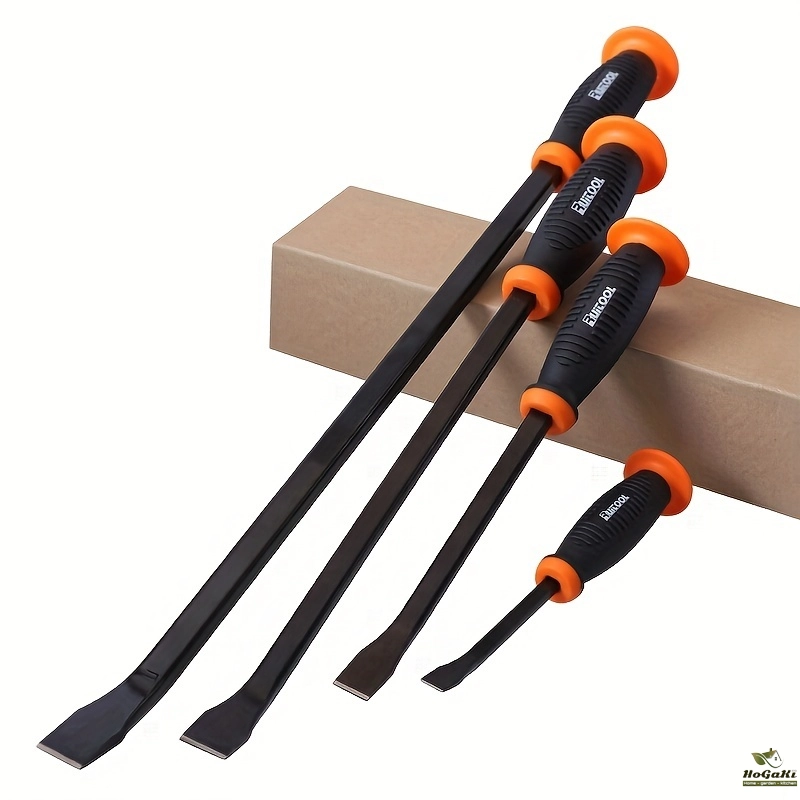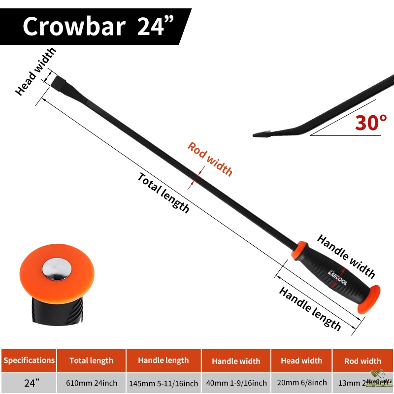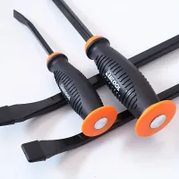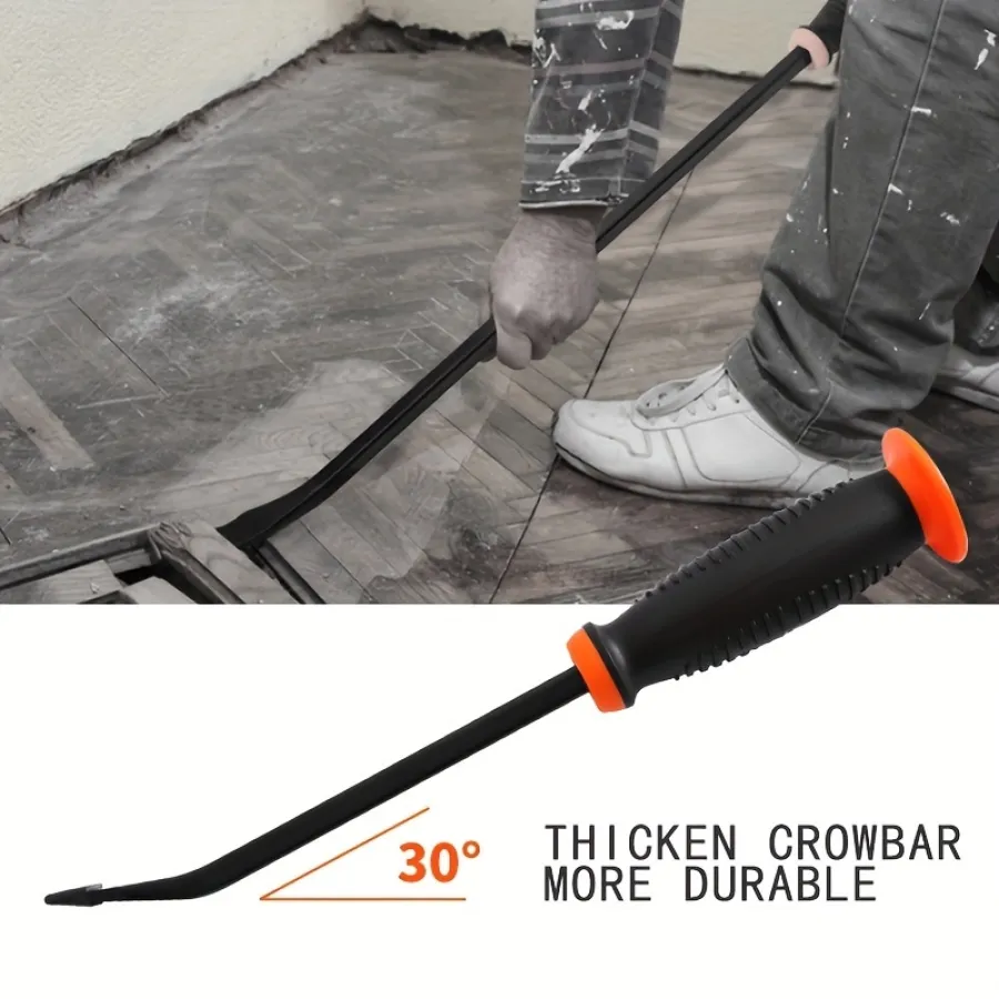 [5]This multifunctional pry bar is steel, which is heat treated for high hardness, durability and high torque.