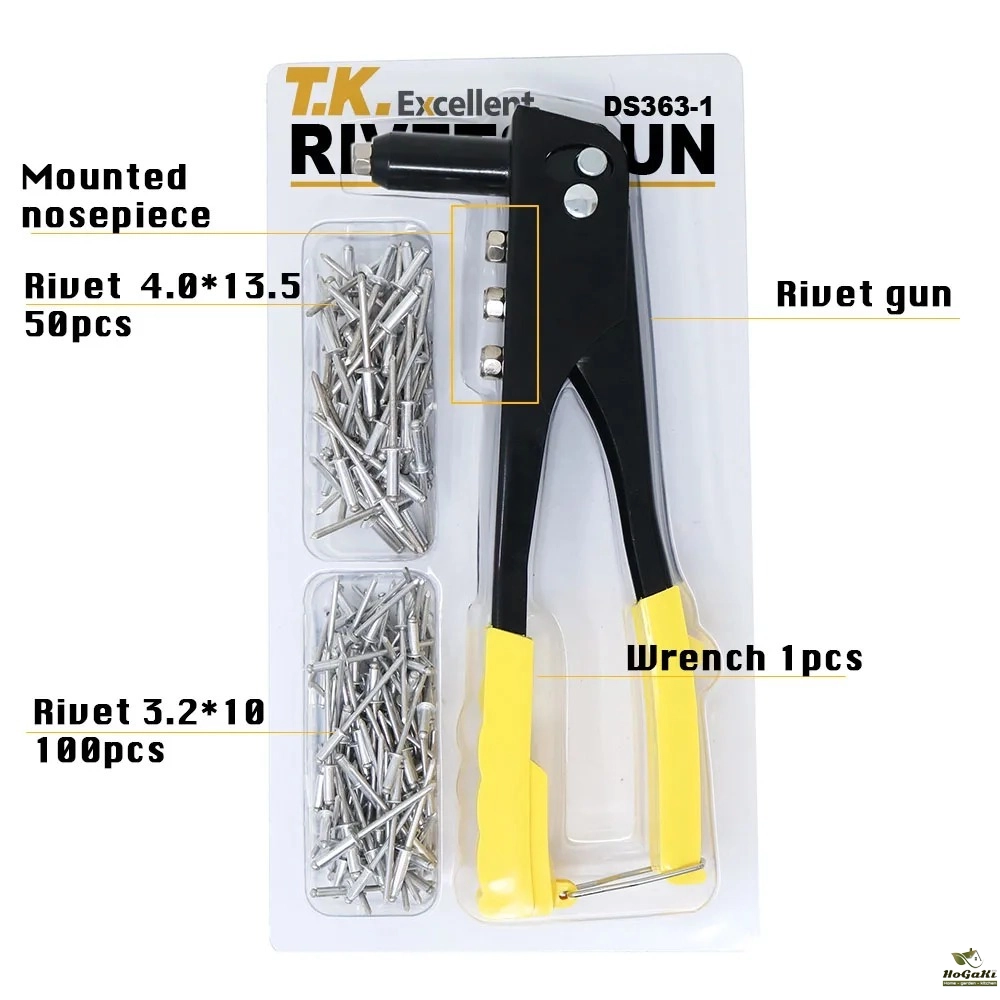 e. This set includes one tacklife hand riveter comes with, wrench store in handle and four mounted nosepieces, in 3/32"(2.4mm), 1/8"(3.2mm), 5/32"(4.0mm) and 3/16"(4.8mm). Also have two size of aluminum dome blind rivets: 3.2*10mm and 4.0*13.5mm.