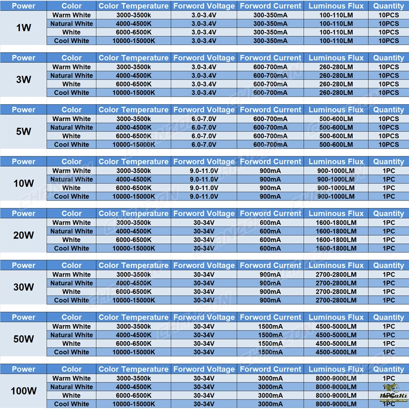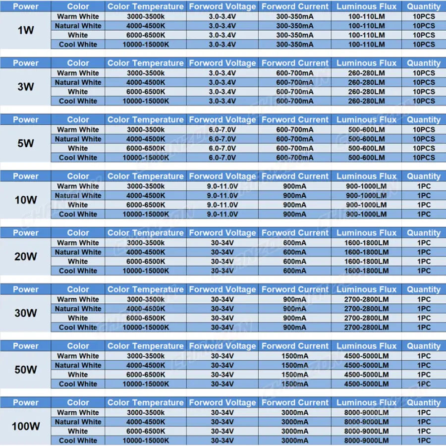Rated Power: 1W 3W 5W 10W 20W 30W 50W 100W