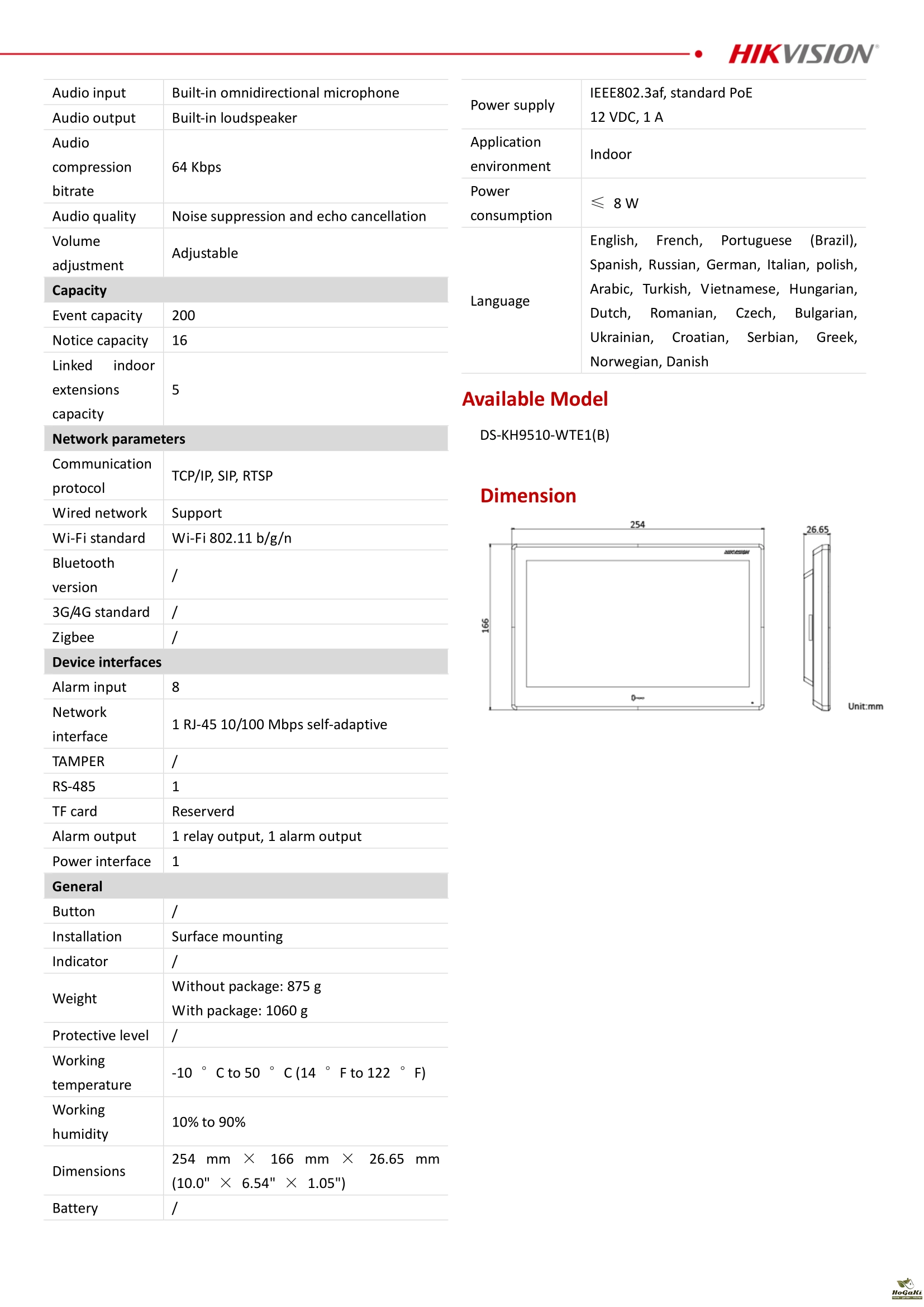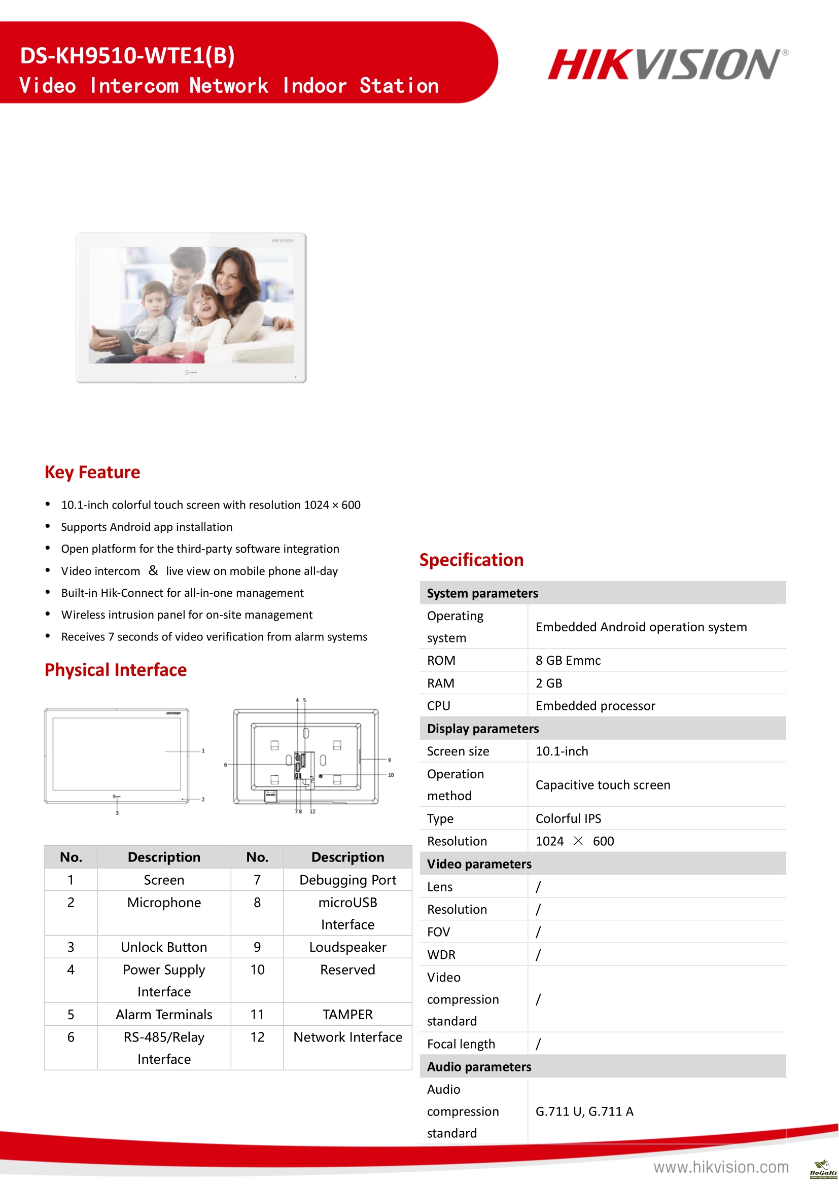 Hikvision IP Video Intercom Indoor Station WIFI Android All-in-one Monitor POE 10-inch DS-KH9510-WTE1(B)