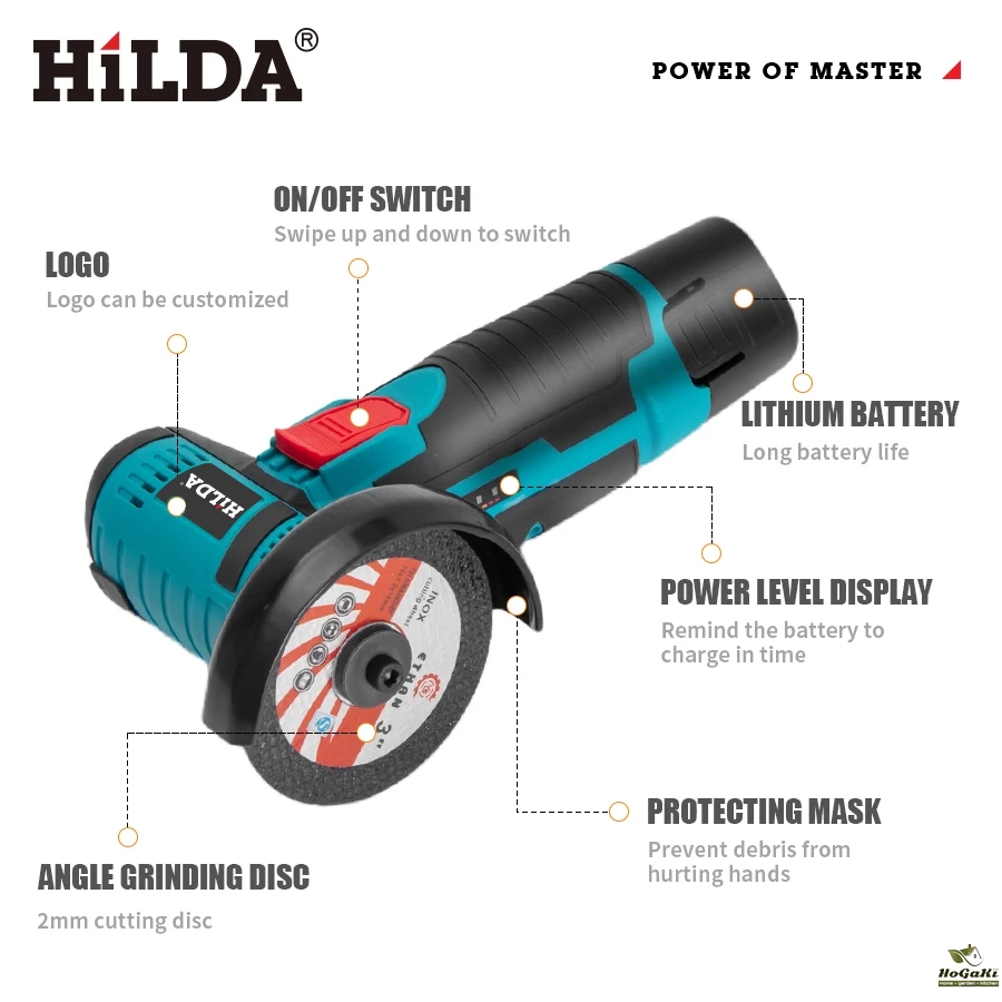 • High-Power Electric Grinder :The HILDA Angle Grinder is a high-power electric tool, perfect for home DIY projects. Its 12V/3 inch lithium design ensures efficient and effective grinding.
