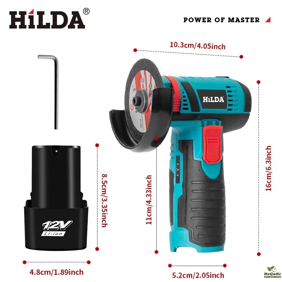• High-Power Electric Grinder :The HILDA Angle Grinder is a high-power electric tool, perfect for home DIY projects. Its 12V/3 inch lithium design ensures efficient and effective grinding.