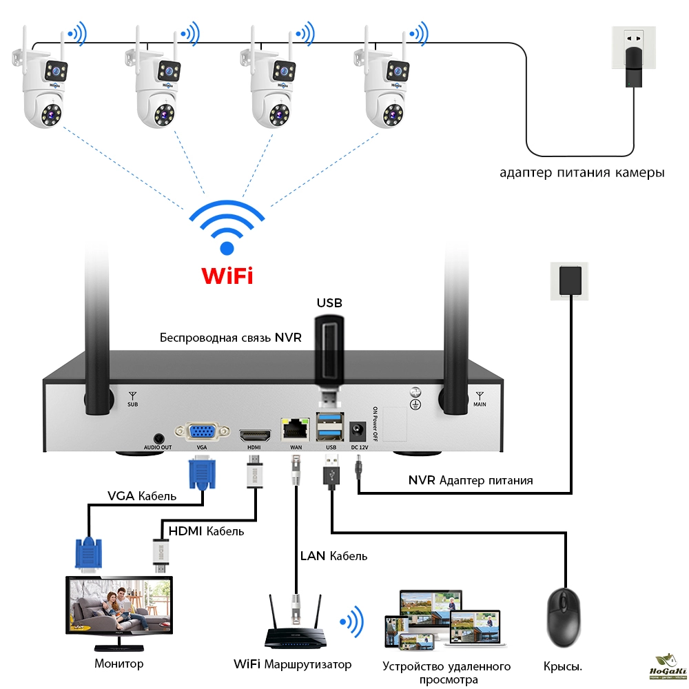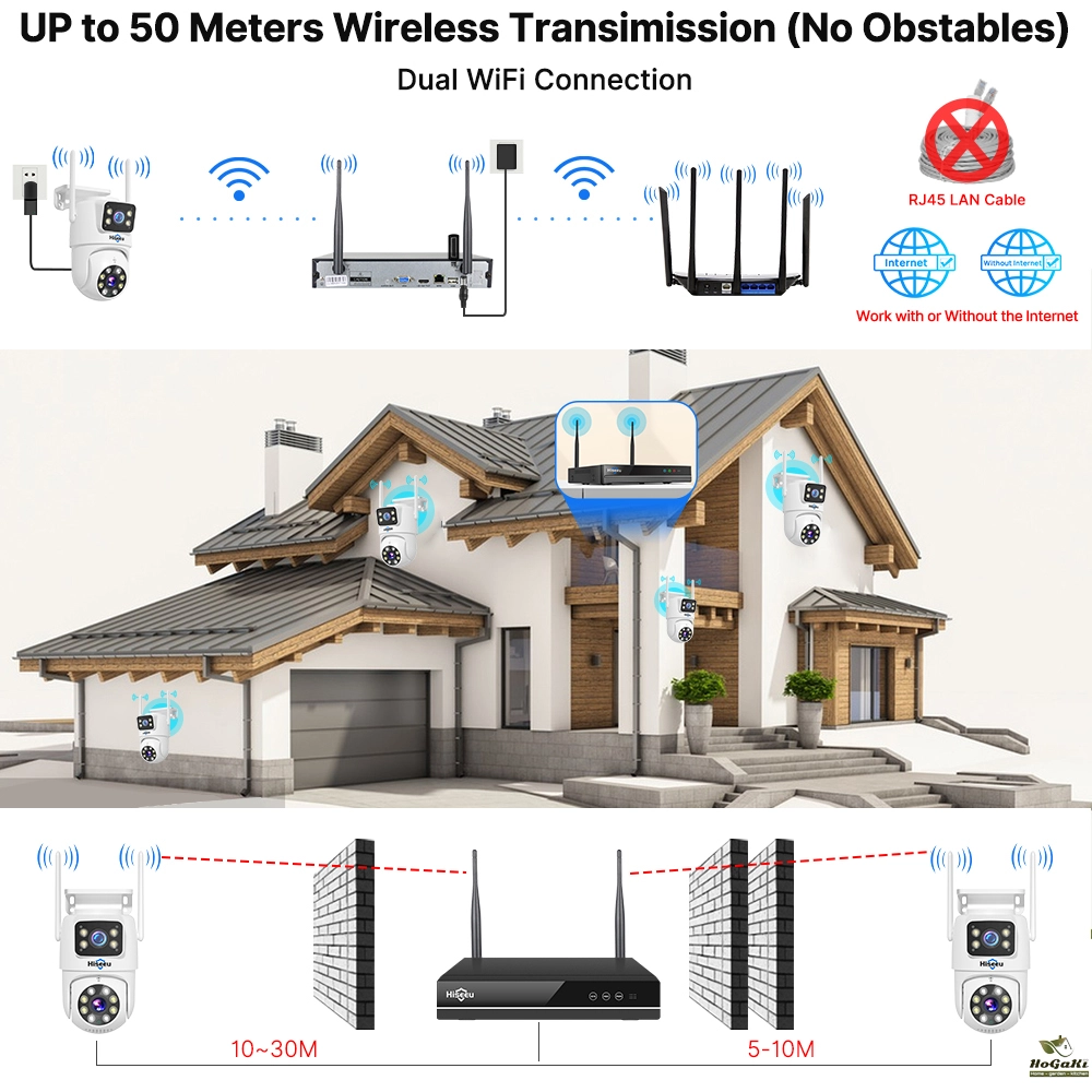 Supports 2.4GHz/5GHz and the wireless signal transmission distance of camera and NVR self-connection can reach 50 meters (without obstacles)