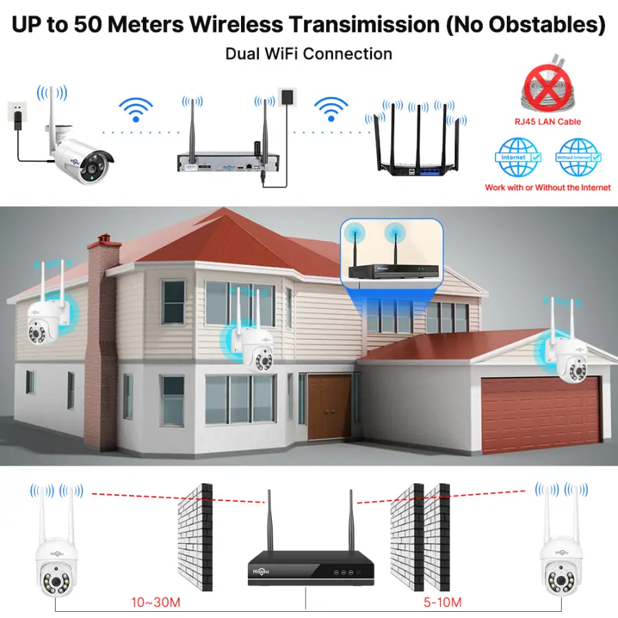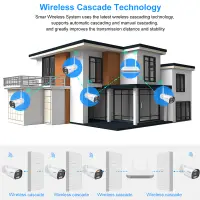 Theoretically, it's maximum wireless distance is 50M if no any obstacles.this wireless system uses the latest wireless cascading technology. When the camera is far away from the NVR, wireless cascade technology allows the camera to transmit the signal to another camera closest to it. The wireless cascade technology greatly improves the transmission distance and stability.