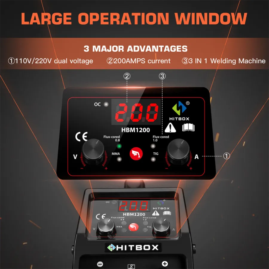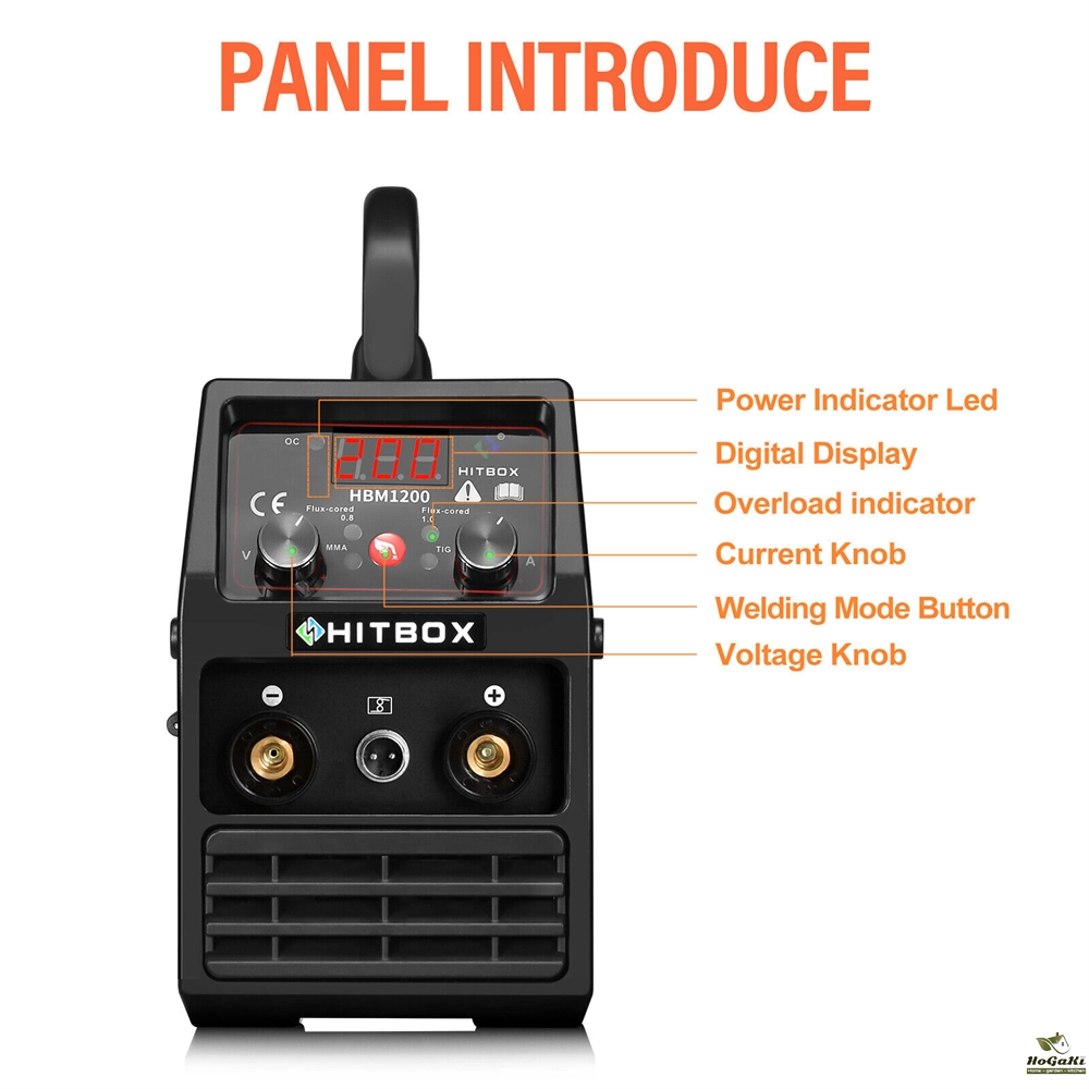 【Excellent Welding Characteristics】: HITBOX HBM1200 mig welder panel is easy to operate.This welder has power settings and adjustable wire feed speed, 20-120A working current is suitable for 0.8-4.0mm metal plate welding.
