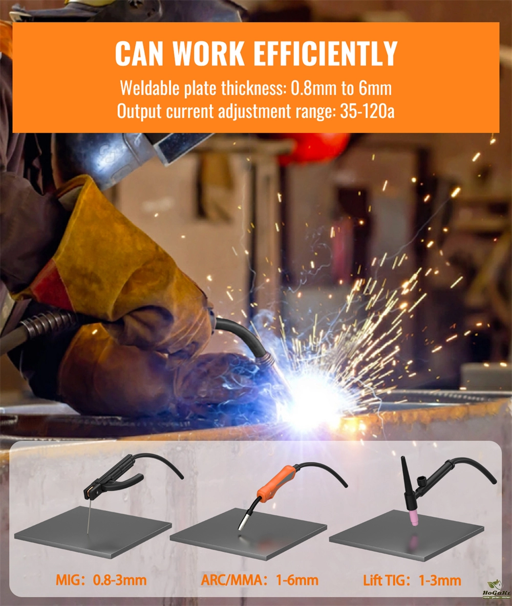 【Quality and Safety】: HITBOX HBM1200 The efficiency of gasless continuous wire welder 120A@100% 93A@60%.The welding unit is equipped with a cool air radiator, overheat protection and VRD function.Insulation class: F Protection class: IP21.