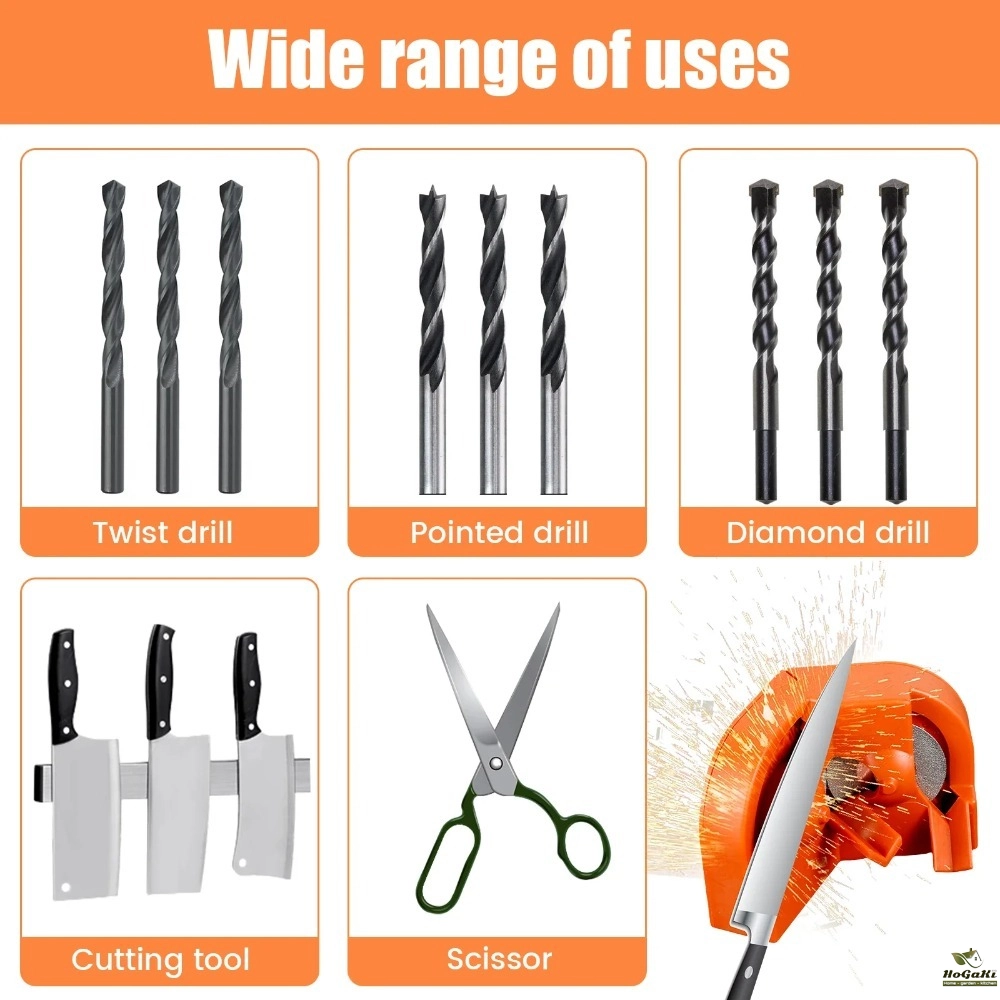 ELECTRIC SHARPENER: This multifunctional sharpener is very practical and designed for sharpening flat , drills, scissors, cutlery and more. It is powered by an electric drill and is suitable for all types of drills such as high speed steel, carbide, twist and cobalt. It can also be used for other tools such as kitchen , etc.