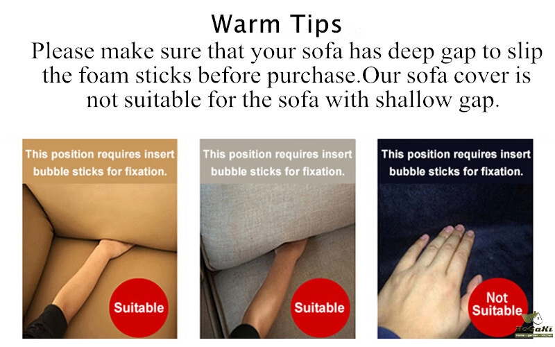 1. This sofa cover applicable to sofa which there is a gap,between seat with backrest and armrest.(Please make sure that your sofa has deep gap to slip the foam bars before purchase.Our sofa cover is not suitable for the sofa with shallow gap.)