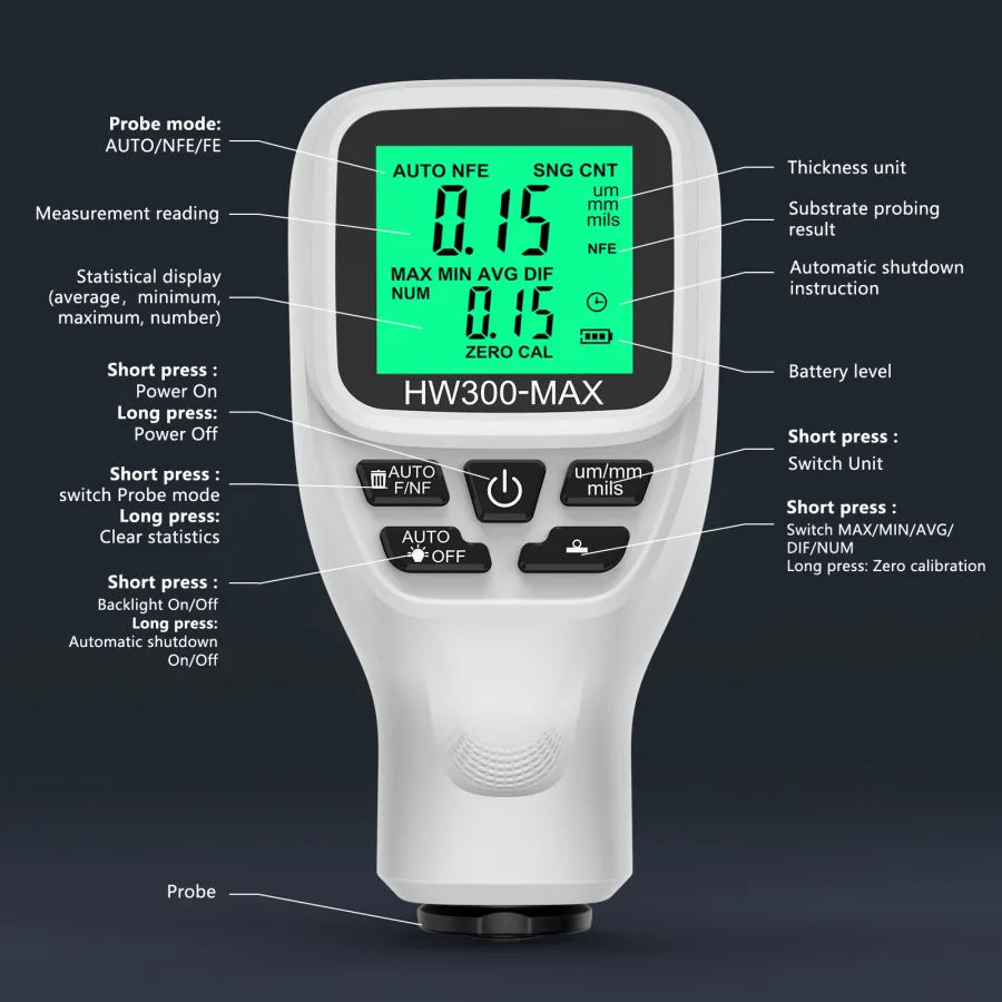 HW300-MAX Thickness Gauge 0-2000UM Car Coating Thickness Gauge LCD Automotive Paint Film Tester DFT Meter Cars Measuring Tools